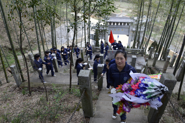 2015年4月1日上午8点,市机电学校14春社会艺术专业学生师生在党支部书记王海安、第三党小组组长、班主任简光军带领下来到“6·3”空难烈士陵园进行祭扫活动。