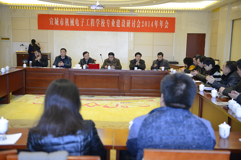 为更好的加强专业建设,更科学、合理地制定各专业人才培养方案, 12月26日下午,宣城市机械电子工程学校召开专业建设研究会2014年年会。宣城职业技术学院、安徽材料工程学校、宣城工业学校、宣城信息工程学校、广德易家网有限公司、安徽荣华机械制造有限公司等院校、行业企业的30位代表参加会议。宣城市教体局职教科科长高利兵、广德县教体局党委委员、办公室主任陈传胜到会指导。