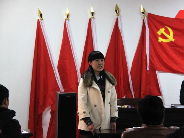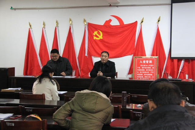 会议在《国歌》声中开始,主持人宣读了中共广德县教育体育局委员会“预备党员通知书”,在热烈的掌声中,预备党员陈玉洁在陈道才老师的带领下,面对鲜红的党旗,庄严宣誓:我志愿加入中国共产党,拥护党的纲领,遵守党的章程,履行党员义务,执行党的决定,严守党的纪律,保守党的秘密,对党忠诚,积极工作,为共产主义奋斗终身,随时准备为党和人民牺牲一切,永不叛党。