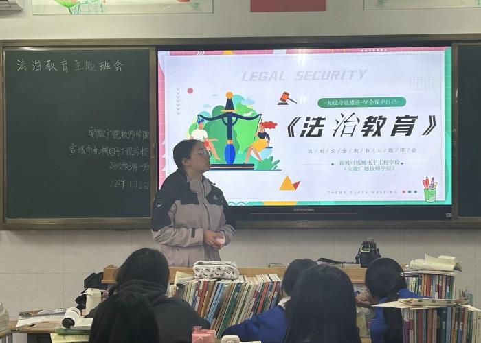 为进一步提高学生的法治意识和法律素养,引导学生自觉形成遵法、学法、守法、用法的意识,11月8日,宣城市机械电子工程学校(安徽广德技师学院)开展“法治教育”主题班会活动。