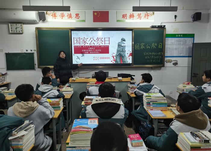 12月13日下午,各班举行“国家公祭日”主题教育班会,班会上,各班的班主任带领队员们通过一个个数字,一段段真实事件,将历史再次还原出来。而事实上,史实要比这些残忍无数倍,紧急无数倍,恐怖无数倍,绝望无数倍。班主任们号召同学们:无论怎样,我们都不能让沉痛的历史重演,我们需要和平,因为只有和平才能真正慰藉遇难同胞的亡灵。我们缅怀逝者,但不被泪水遮挡视线。国家的祭奠,只为凝聚民族意志,汲取前进力量!