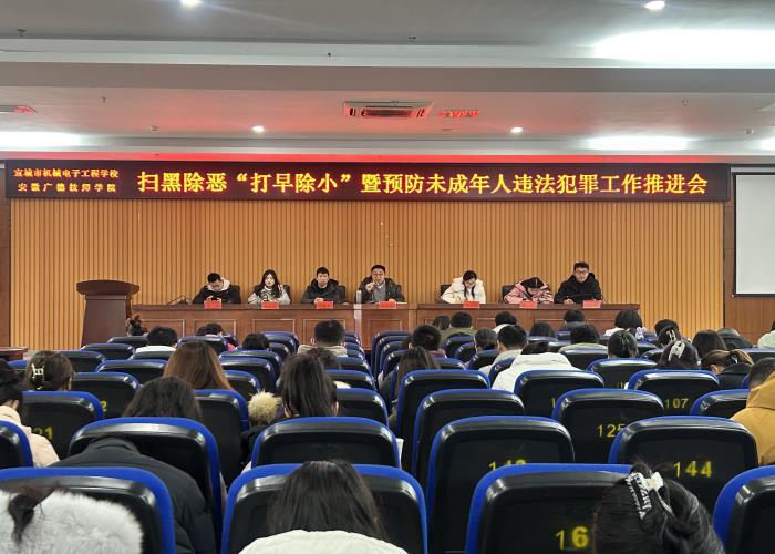 为进一步加强法治安全教育,切实预防青少年违法犯罪,保护未成年人的合法权益,守护未成年人健康成长,营造文明、平安、和谐的校园环境,12月28日,宣城市机械电子工程学校(安徽广德技师学院)召开扫黑除恶“打早除小”暨预防未成年人违法犯罪工作推动会,会议由校学生处主任章银照,各系部学管主任,学生处副主任李君璐,学生处德育员程明,全体班主任参加。会议由章银照主持。