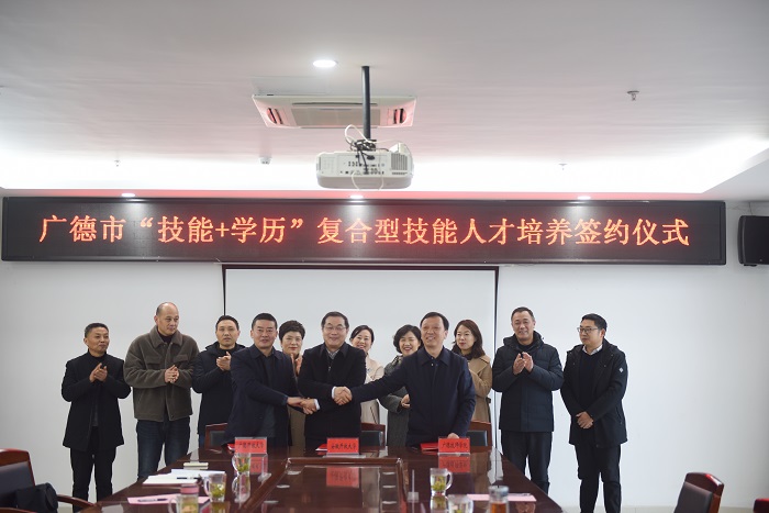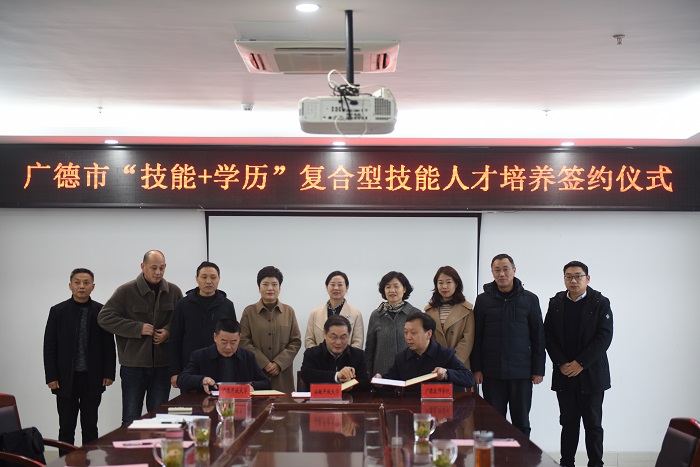 12月30日,广德市“技能+学历”复合型技能人才培养签约仪式在安徽广德技师学院(宣城市机械电子工程学校)举行。安徽开放大学党委委员、副校长诸咸斌,安徽开放大学招生与体系建设办公室主任李秀华,广德市副市长江晓华,宣城市机械电子工程学校党委副书记、校长陈传胜,安徽开放大学教务处教学管理科科长陈薇出席活动,广德市开放大学、安徽广德技师学院相关负责人参加活动。广德市委教体工委书记、市教体局局长邱秀敏主持活动。