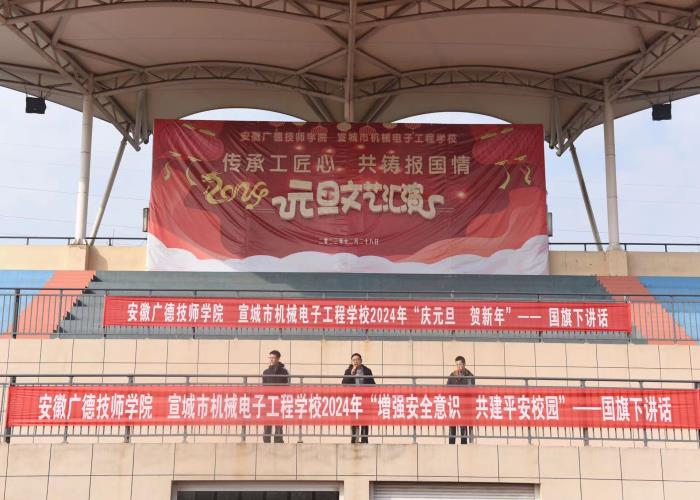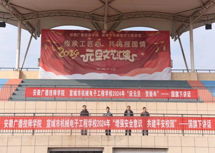 凯歌高奏辞旧岁,豪情满怀迎新年,宣城市机电学校于1月9日上午举行了主题为“庆元旦,贺新年”暨“增强安全意识 共建平安校园”升旗仪式,仪式由校团委书记杨伟乾主持,校学生处主任章银照进行国旗下讲话。