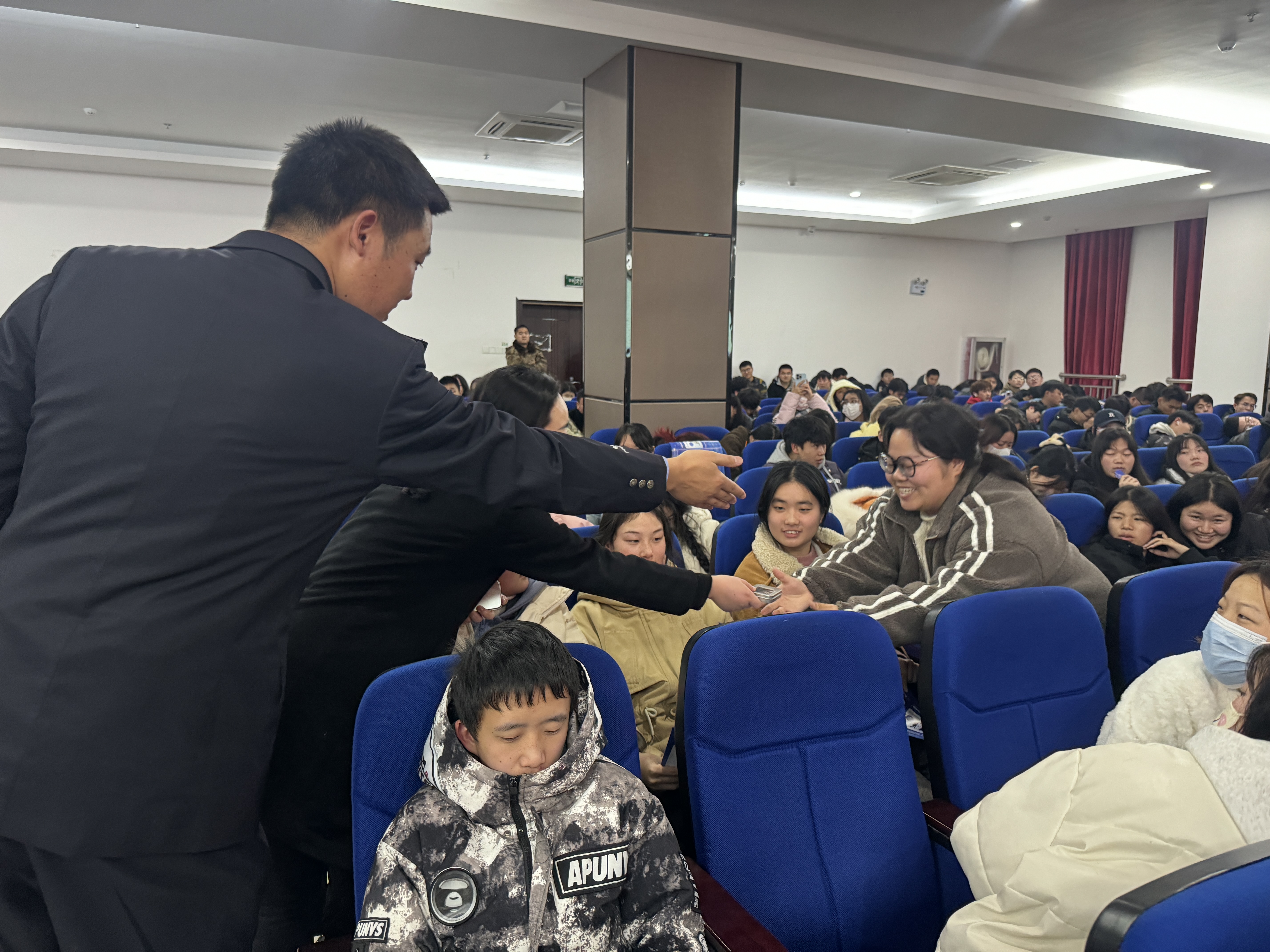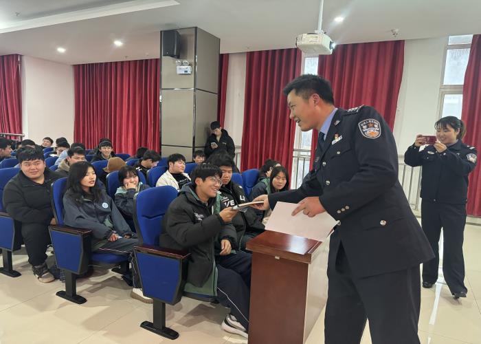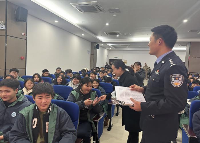 活动还设置了宣传页发放和竞答互动环节。在竞答互动环节中,同学们积极参与,现场互动气氛活跃,掌声热烈,取得良好宣传效果。最后,俞警官向每位在场同学分享了视频,为大家打造全方位的反诈防护网。