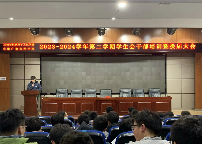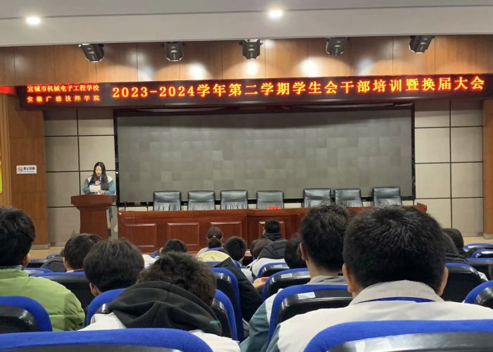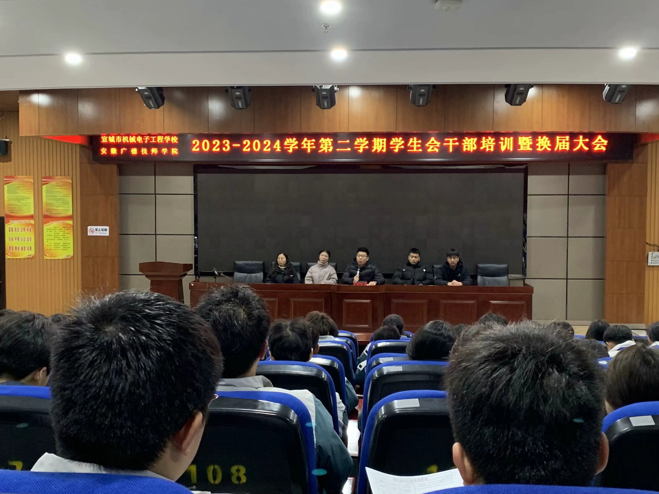 薪火相传,行稳致远。2月28日,宣城市机电学校2023-2024学年第二学期学生会干部培训暨换届大会在校图书信息中心一楼报告厅举行。本次会议由校团委书记杨伟乾主持,校团委副书记张颖,团委委员段敏、赖鑫照、景龙龙参与此次换届大会。