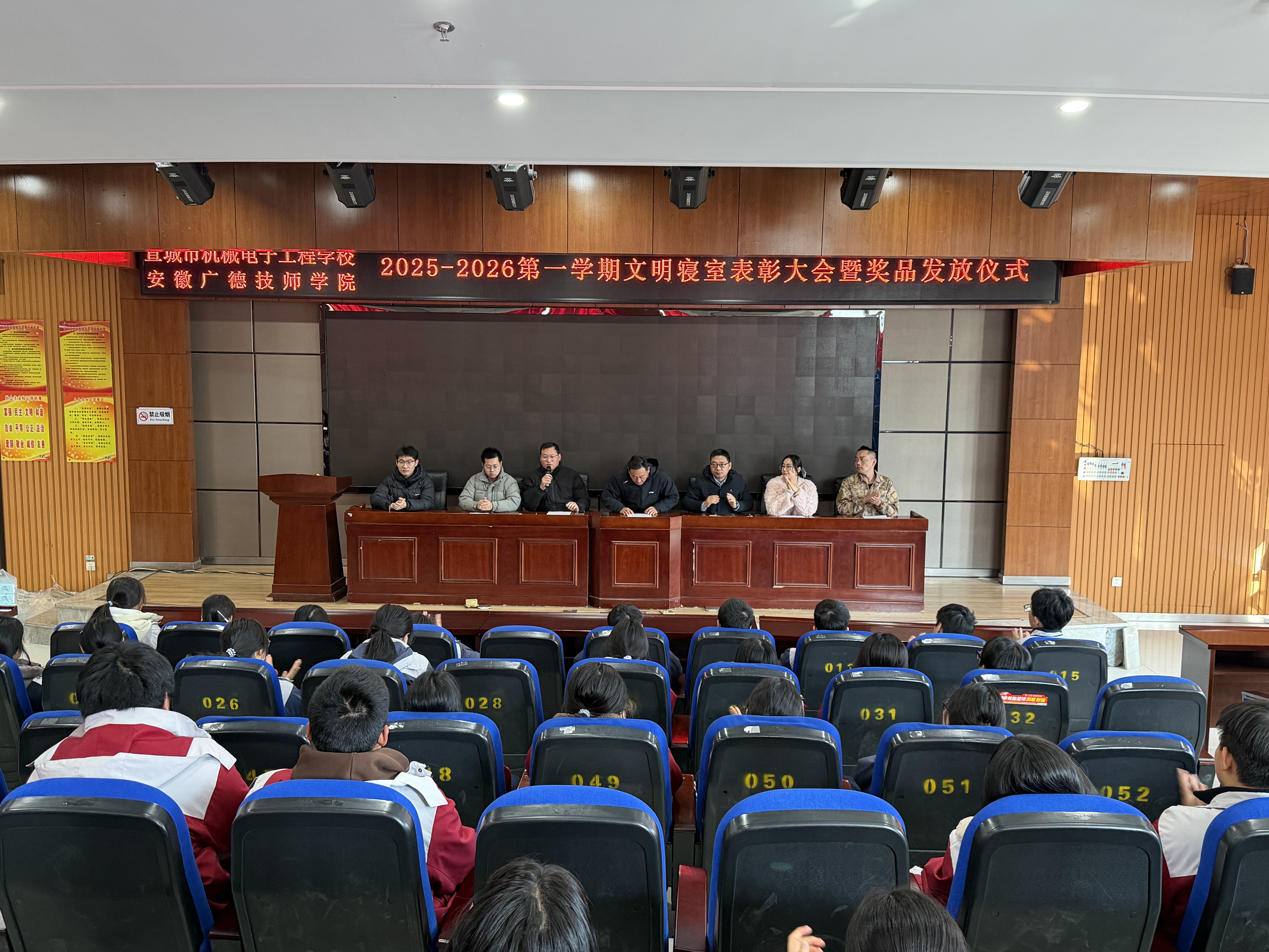 为深入推进校园文明建设,营造整洁、和谐、有序的寝居环境,充分发挥先进典型的示范引领作用,1月16日上午,宣城市机械电子工程学校(安徽广德技师学院)在图书信息中心一楼会议室,召开2025-2026学年第一学期文明寝室表彰大会暨奖品发放仪式。校党委副书记、副校长杨林,学生处主任章银照,学生处副主任石洋,机电工程系部学管主任程明,商贸信息部学管主任易诚成出席大会,各班级学生代表及受表彰寝室成员参加大会。