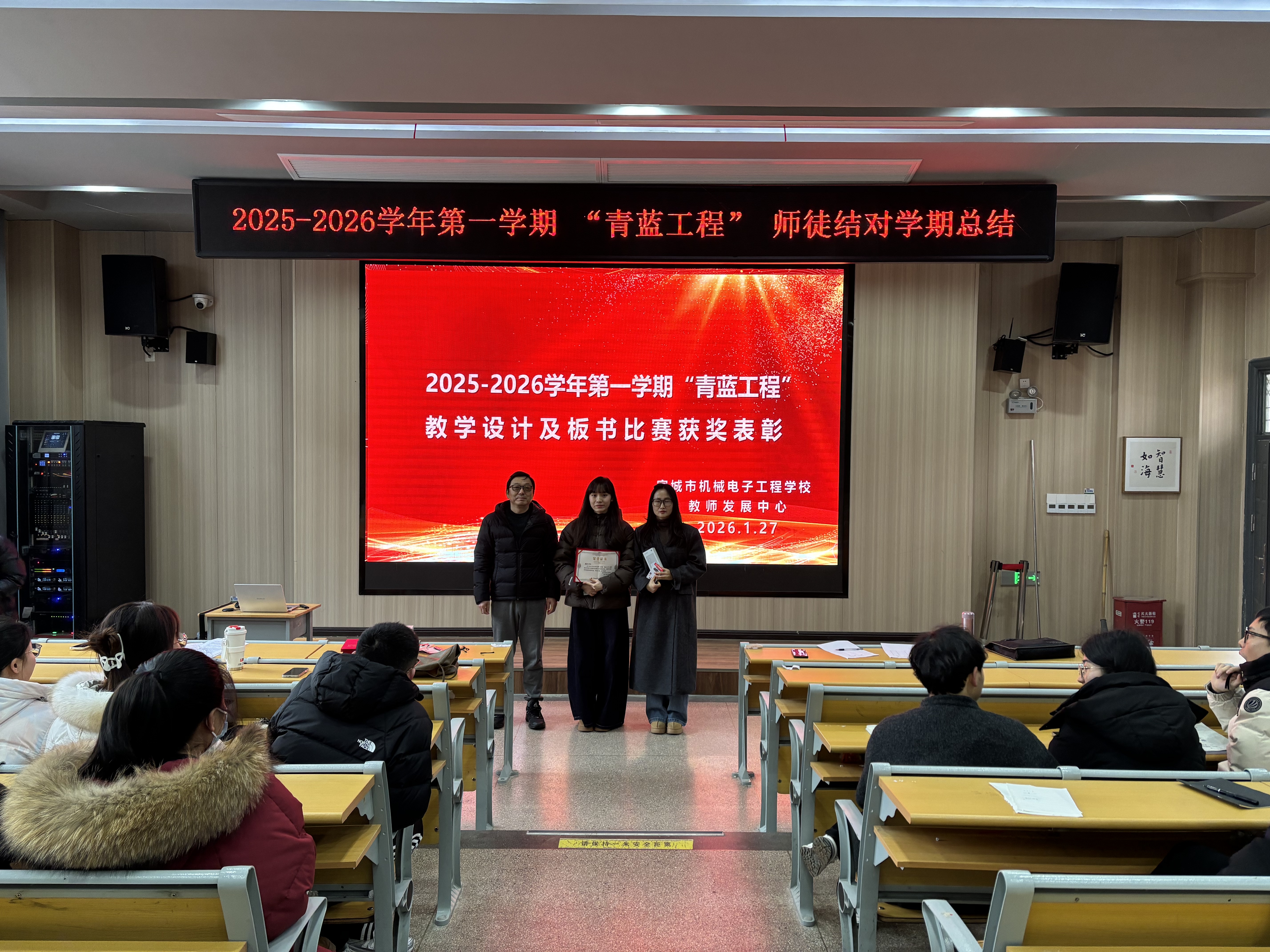 会议第一项,何丽娜就2025-2026学年度第一学期“青蓝工程”新教师教学设计及板书比赛活动进行了全面总结。她在肯定全体新教师一学期以来始终保持谦逊好学、积极进取态度,认真参与教研、主动请教、勤于反思的同时,也指出了比赛中暴露出的部分问题:如教学设计书写规范性有待加强,对教学目标、重难点的把握需更精准,教学流程的逻辑性与连贯性有待提升;少数教师对教学设计理解存在偏差,未能充分结合学情优化环节,导致设计与课堂实践衔接不足。会上,何丽娜为在比赛中表现优异的戴静、李春辉、方敏、朱傲楠四位新教师及其指导教师颁发了获奖证书,师徒共同上台合影留念。