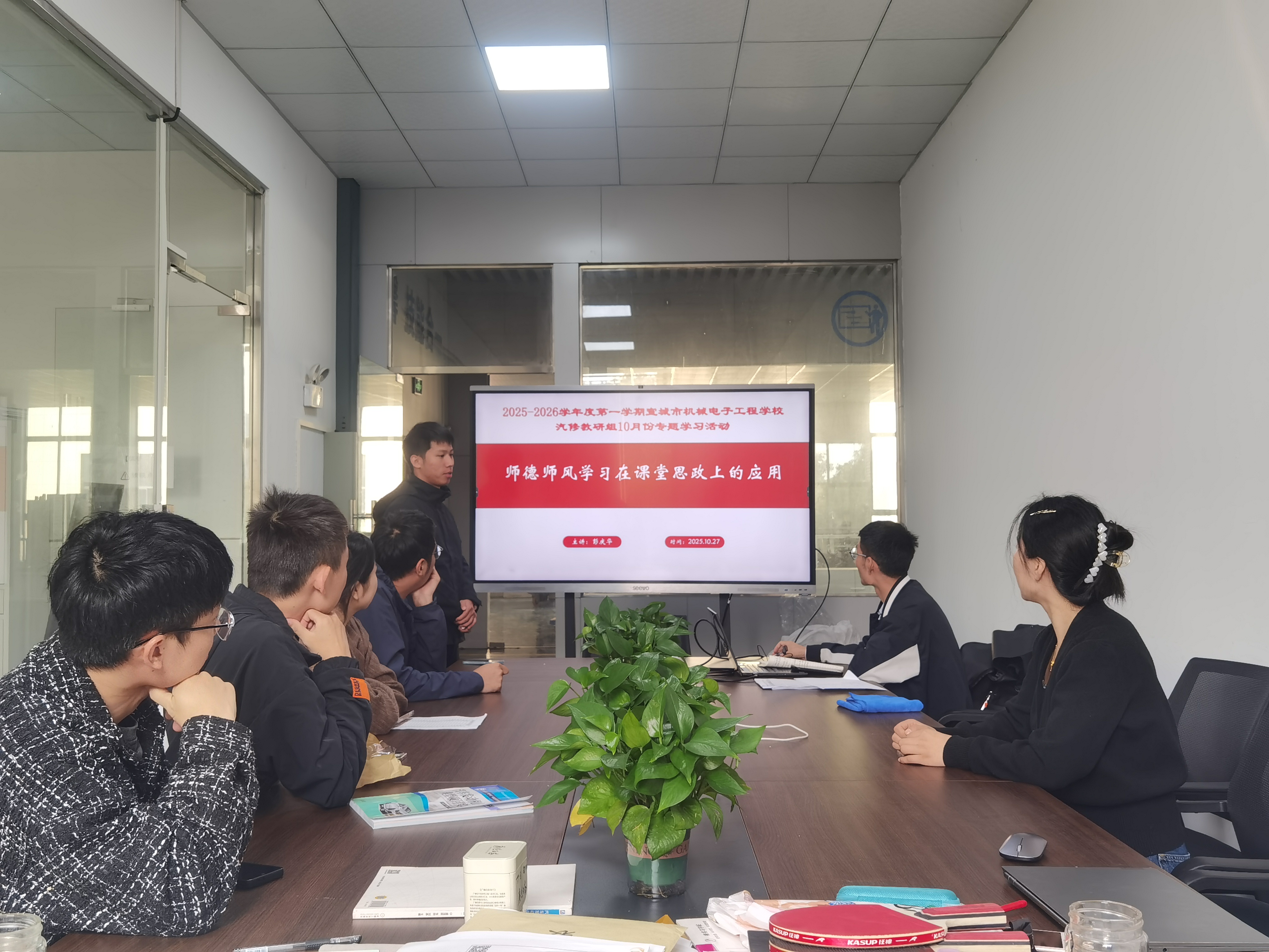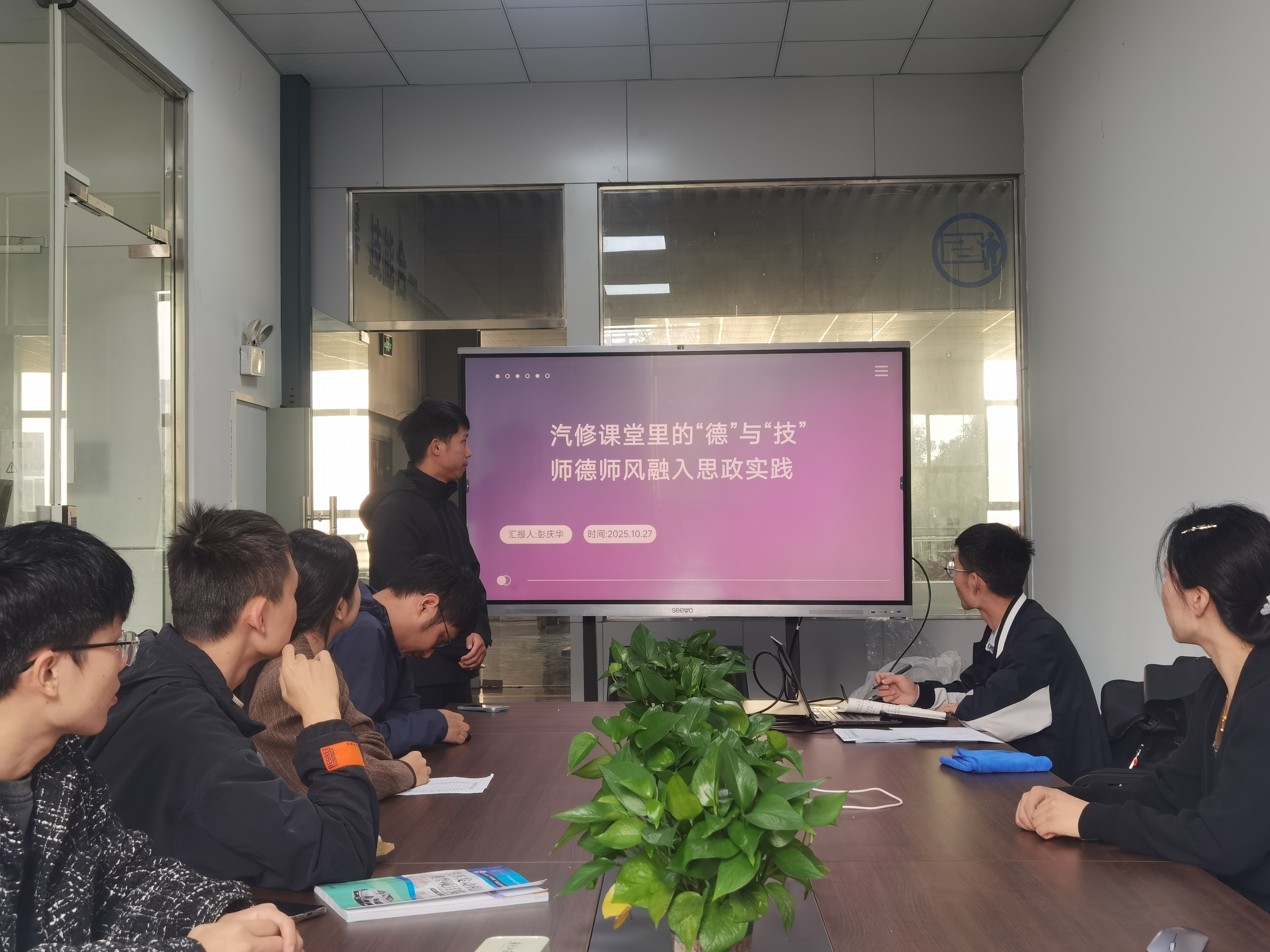 为深入贯彻落实立德树人根本任务,将师德师风建设贯穿教育教学全过程。2025年10月27日上午,汽修教研组开展了以“师德师风学习在课堂思政上的应用”为专题的学习研讨活动。本次活动由汽修教研组教师彭庆华主讲,汽修专业全体教师参加。