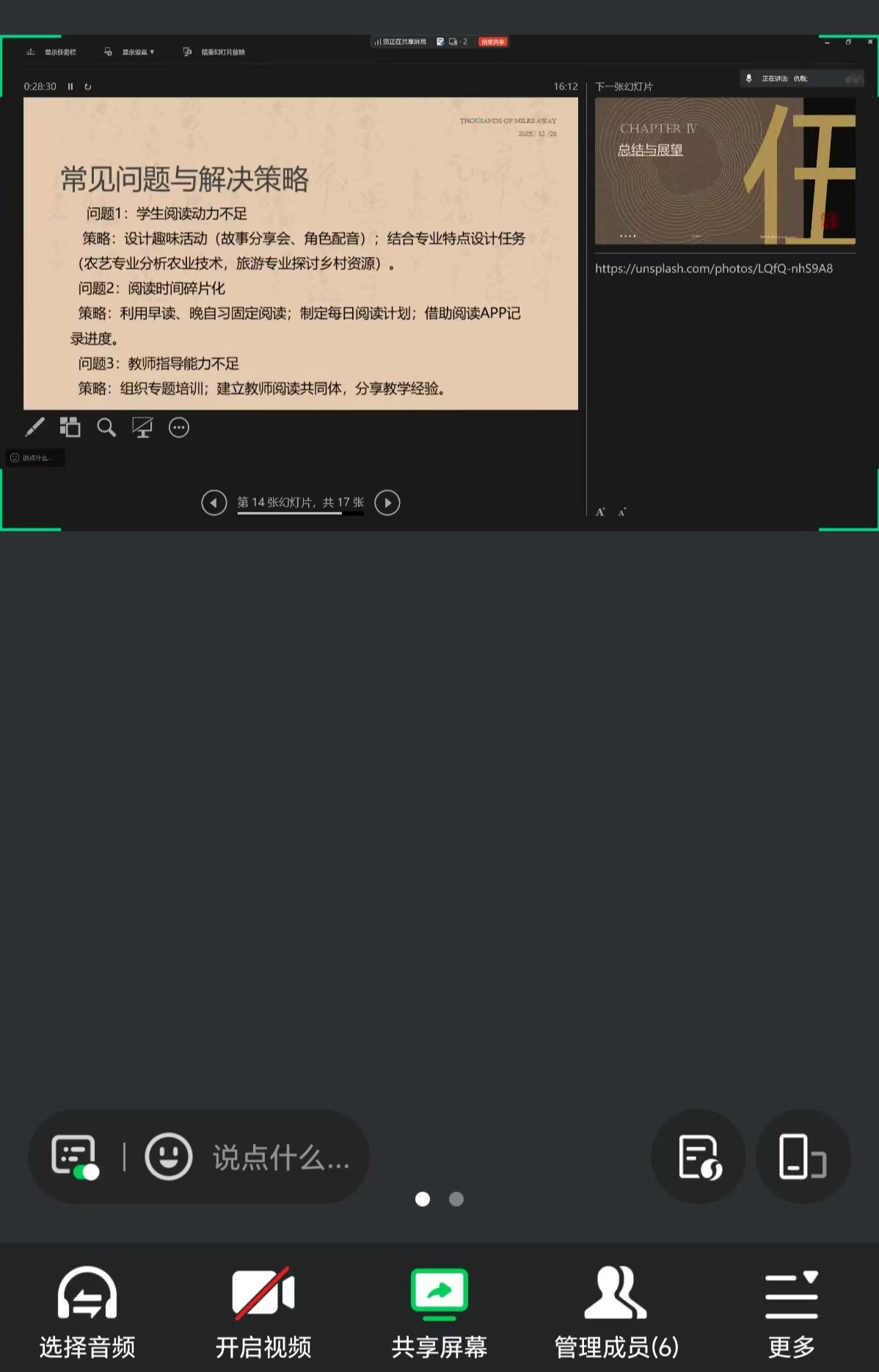 本次研修采用“线上+线下”联动模式,工作室6名成员通过腾讯会议远程参与,其余教师集中于学校五楼会议室线下交流。在研讨环节,线上线下教师踊跃发言,围绕“学生阅读动力激发”“阅读时间整合”“教师指导能力提升”等实际问题展开热烈讨论。多位工作室成员结合各自学校的实践,分享了诸如“跨专业主题阅读”“数字化阅读工具运用”“校本阅读课程开发”等新思路、新做法,展现了工作室团队在教学改革中的积极探索与合力攻坚。