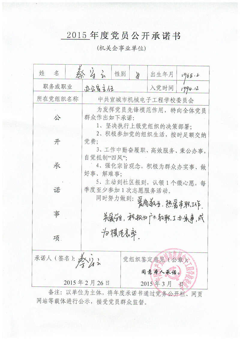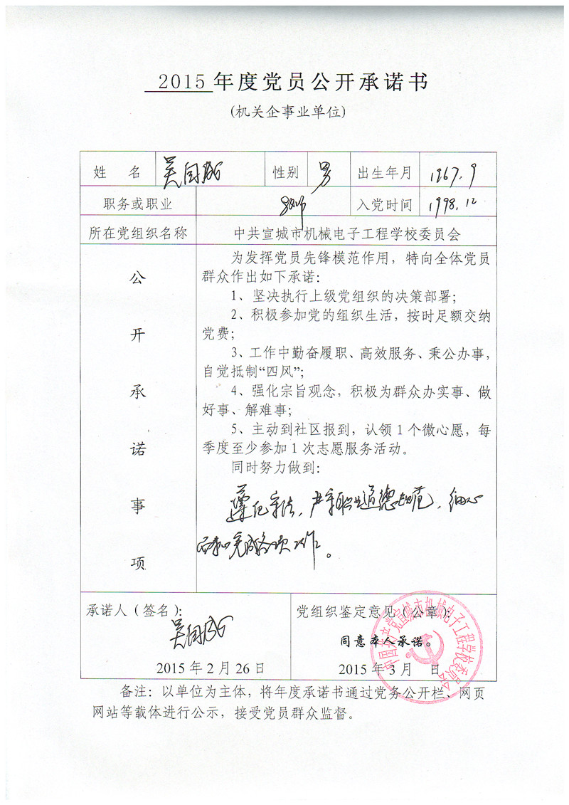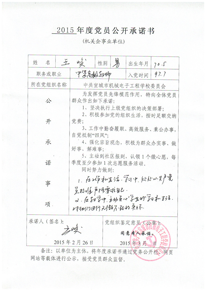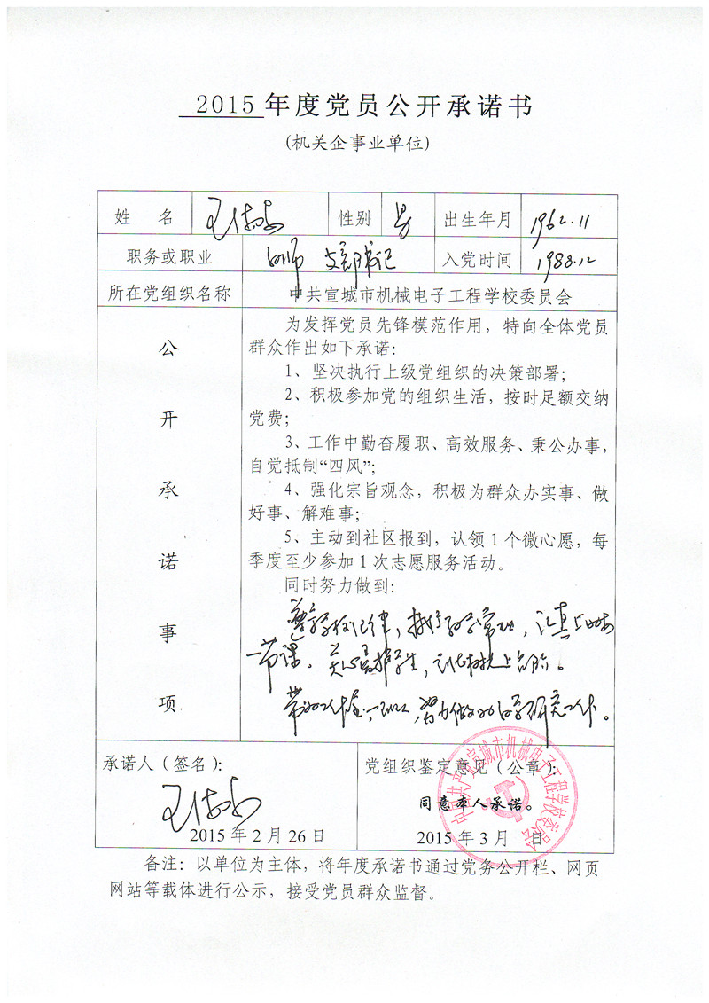 根据县委组织部要求,现将党员管理干部《2015年度党员公开承诺书》予以公示,接受全校党员、群众监督!