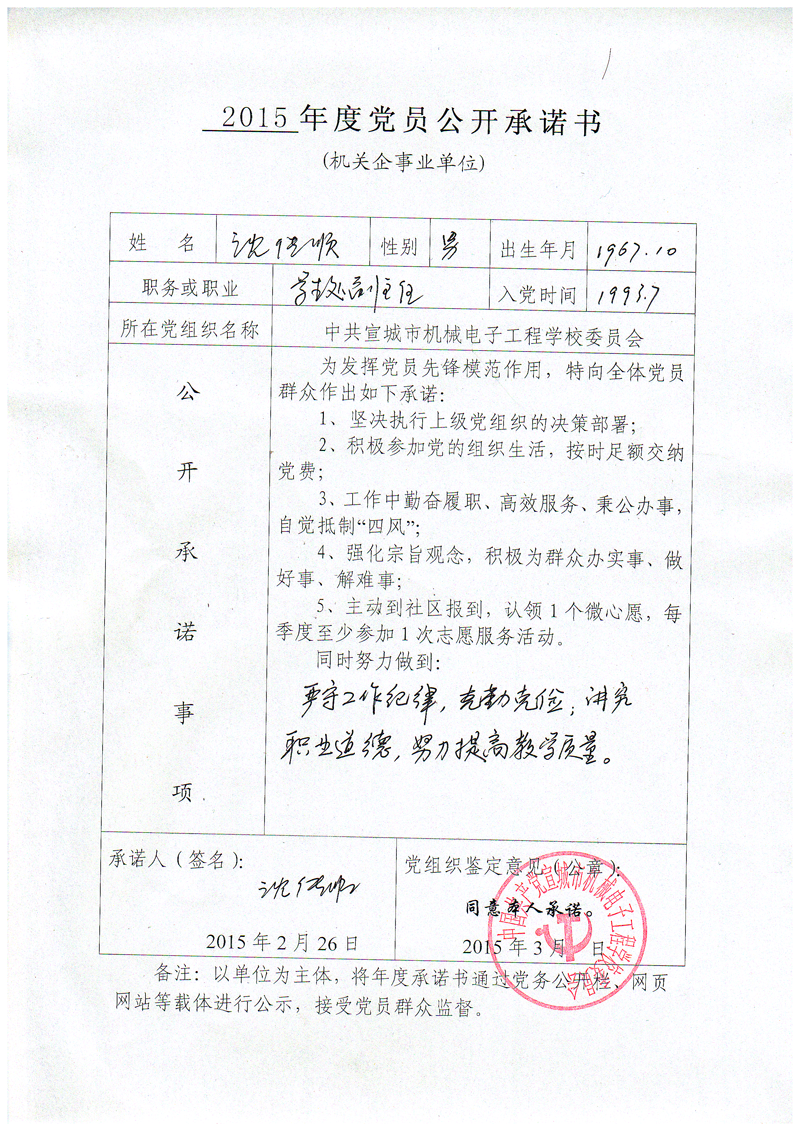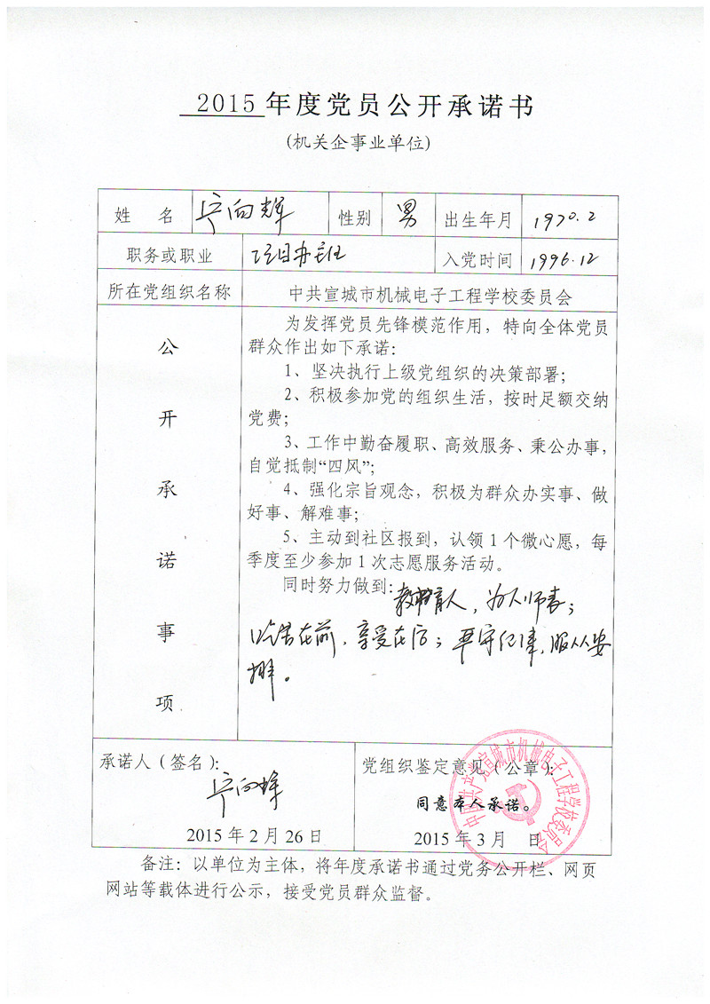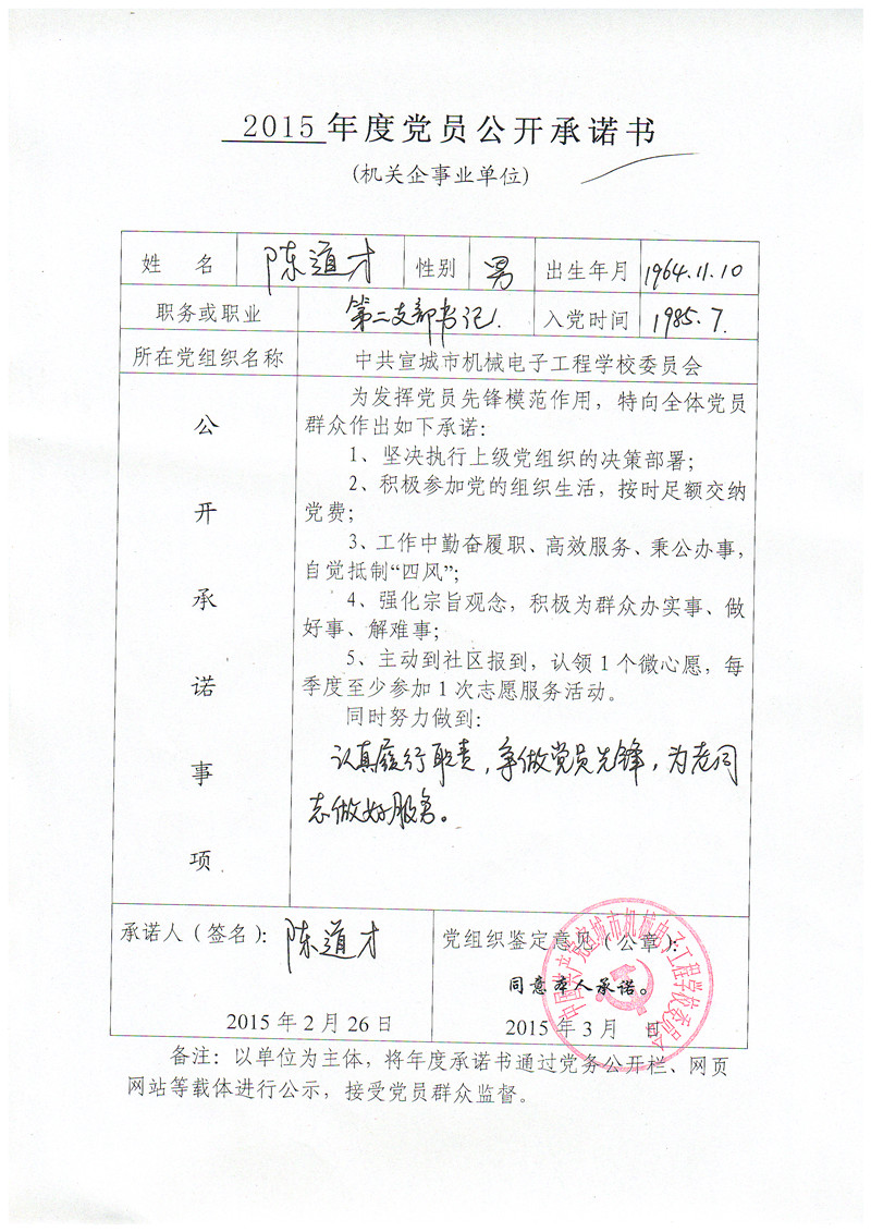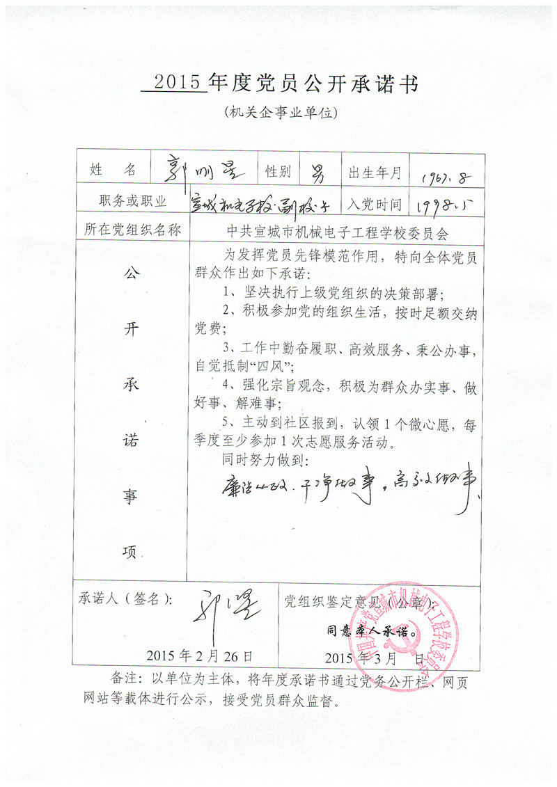根据县委组织部要求,现将党员管理干部《2015年度党员公开承诺书》予以公示,接受全校党员、群众监督!