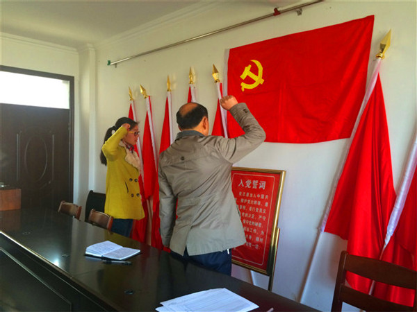 会议对2014年11月批准的新党员进行了宣誓。在宣读了县教体局党委批复后,新党员贾琴在组织委员周承平带领下,面对党旗庄严宣誓:为共产主义奋斗终身!
