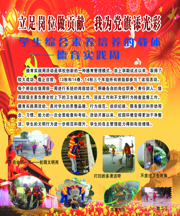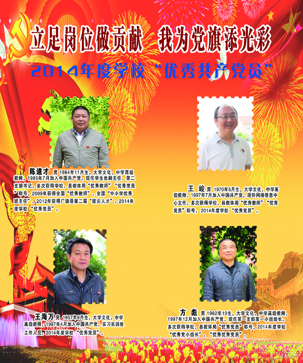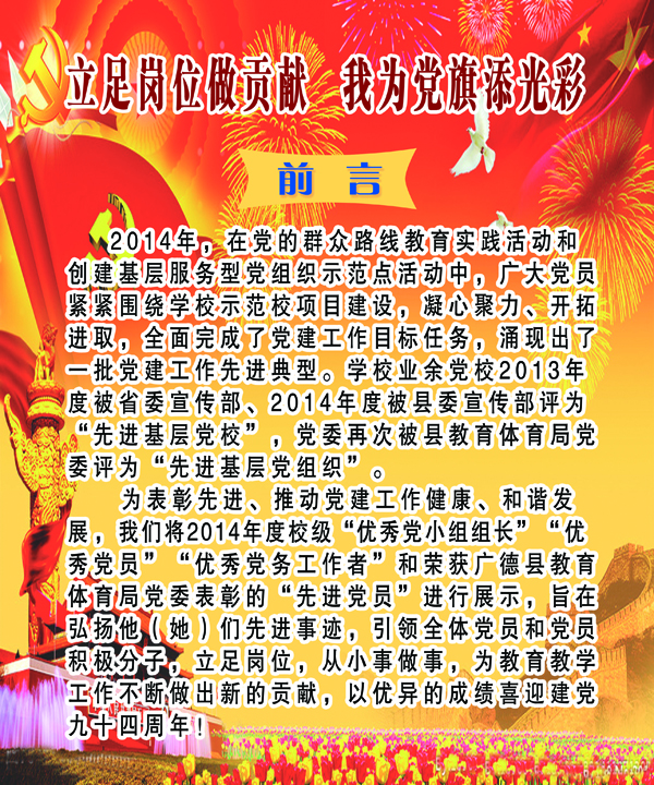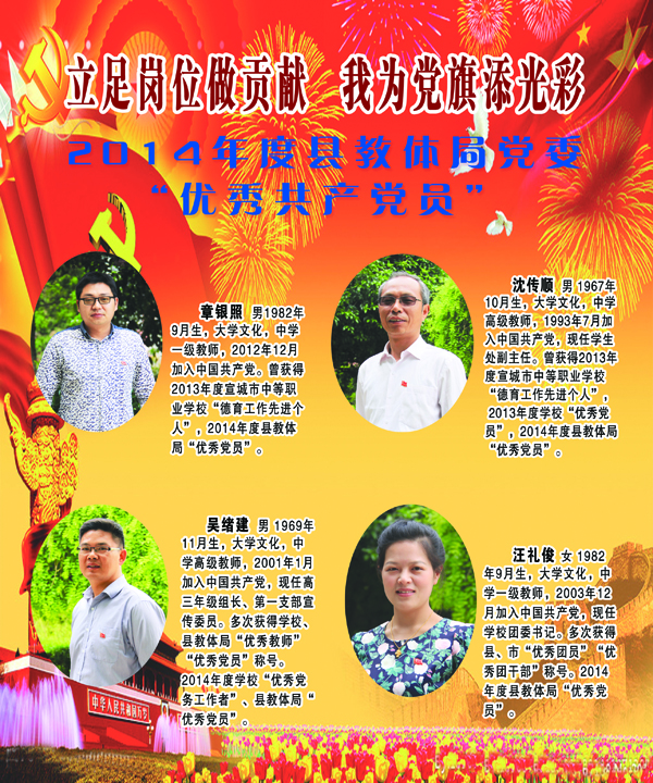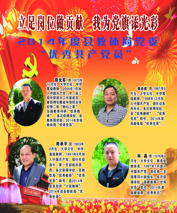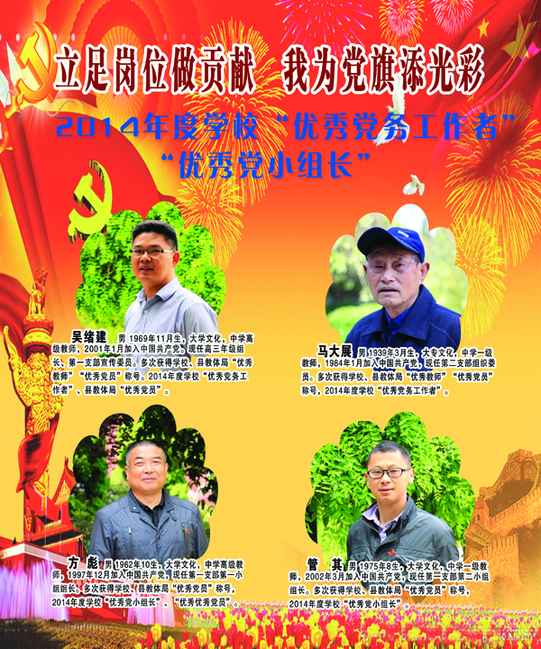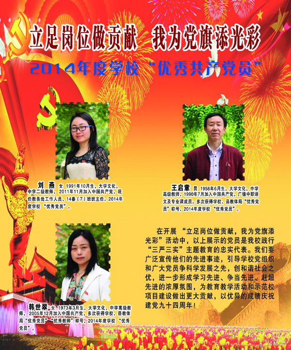 开展党建先进典型事迹展,旨在弘扬他们的先进事迹,引领广大党员和党员积极分子立足本职岗位,践行“三严三实”,为教育教学和示范校项目建设做出更大贡献,以优异成绩迎接建党九十四周年。