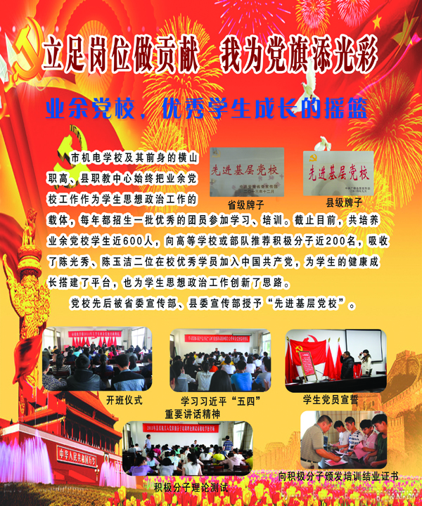5月28日,市机械电子工程学校党委将2014年度县教体局“优秀党员”推荐人选、学校“优秀党务工作者”、“优秀党小组长”、“优秀党员”事迹进行公开展示。同时,该校党委还将学校二项党建品牌——业余党校和德育实践活动成绩一并进行展示。