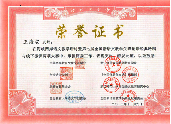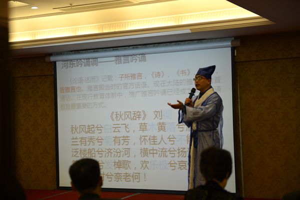 由中华两岸教育文化交流学会(台湾)、浙江师范大学教师教育学院、浙江师范大学浙派语文教育研究中心、《全国优秀作文选》编辑部、全国新语文教学尖峰论坛等单位联合主办的中华海峡两岸教育文化交流经典吟唱大赛2015年11月9日上午在金华星瑞大酒店会议室隆重举行。参赛的选手来自海峡两岸经典吟唱文化的杰出人物、研究专家和水平极高的吟唱爱好者。浙江师大教师教育学院院长周跃良教授、台湾中华两岸教育文化交流学会秘书长曾坤、台北教育大学林于弘教授和来自全国各地的语文教育文化研究专家名流、两岸各地的参赛选手以及国培计划(2015)语文班的全体学员参加了活动。