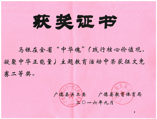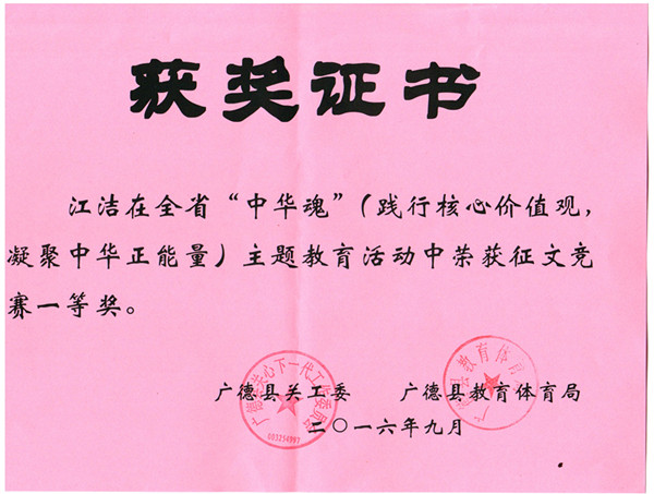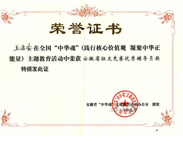 2016年全省首届中小学生“中华魂”(践行核心价值观,凝聚中华正能量)主题征文竞赛结果公布,由市机电学校教师、广德中职语文及专业课名师工作室主持人王海安指导的宣城市机械电子工程学校14春(6)班学生江洁获得省级“优秀奖”、县级一等奖,马银获得县级二等奖,王海安获得省级“优秀辅导奖”。
