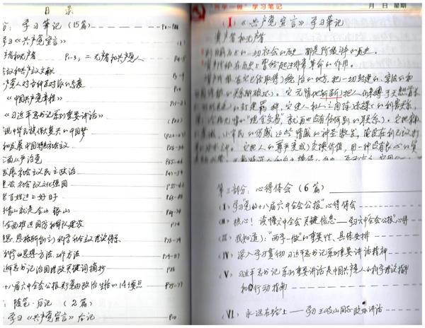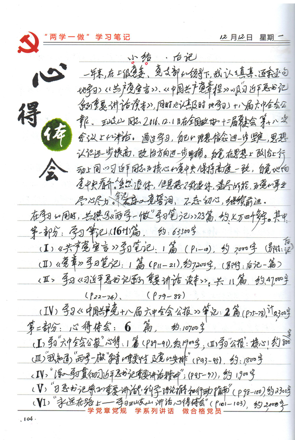 根据《小结▪后记》我们了解到:一年来,朱励先生认认真真、逐条逐句地学习了《共产党宣言》、《中国共产党章程》、《习近平总书记重要讲话读本》以及十八届六中全会系列精神。在学习过程中,朱老师共撰写“两学一做”学习教育笔记23篇,约74,000字。