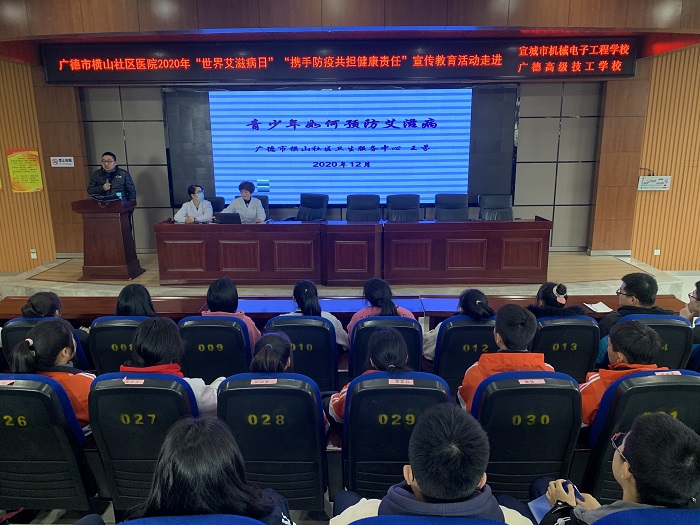 12月1日是第33个“世界艾滋病日”。为进一步普及学生预防艾滋病知识,引导学生正确认识艾滋病,推进学校艾滋病防治工作,12月1日下午,宣城市机电学校(广德高级技工学校)在图书信息中心一楼报告厅开展2020年“世界艾滋病日”宣传教育活动。活动由该校学生科负责人章银照主持,活动邀请广德市横山社区卫生服务中心健康教育科科长王芬作专题报告,全校各班学生代表、学生干部代表近200人参加活动。