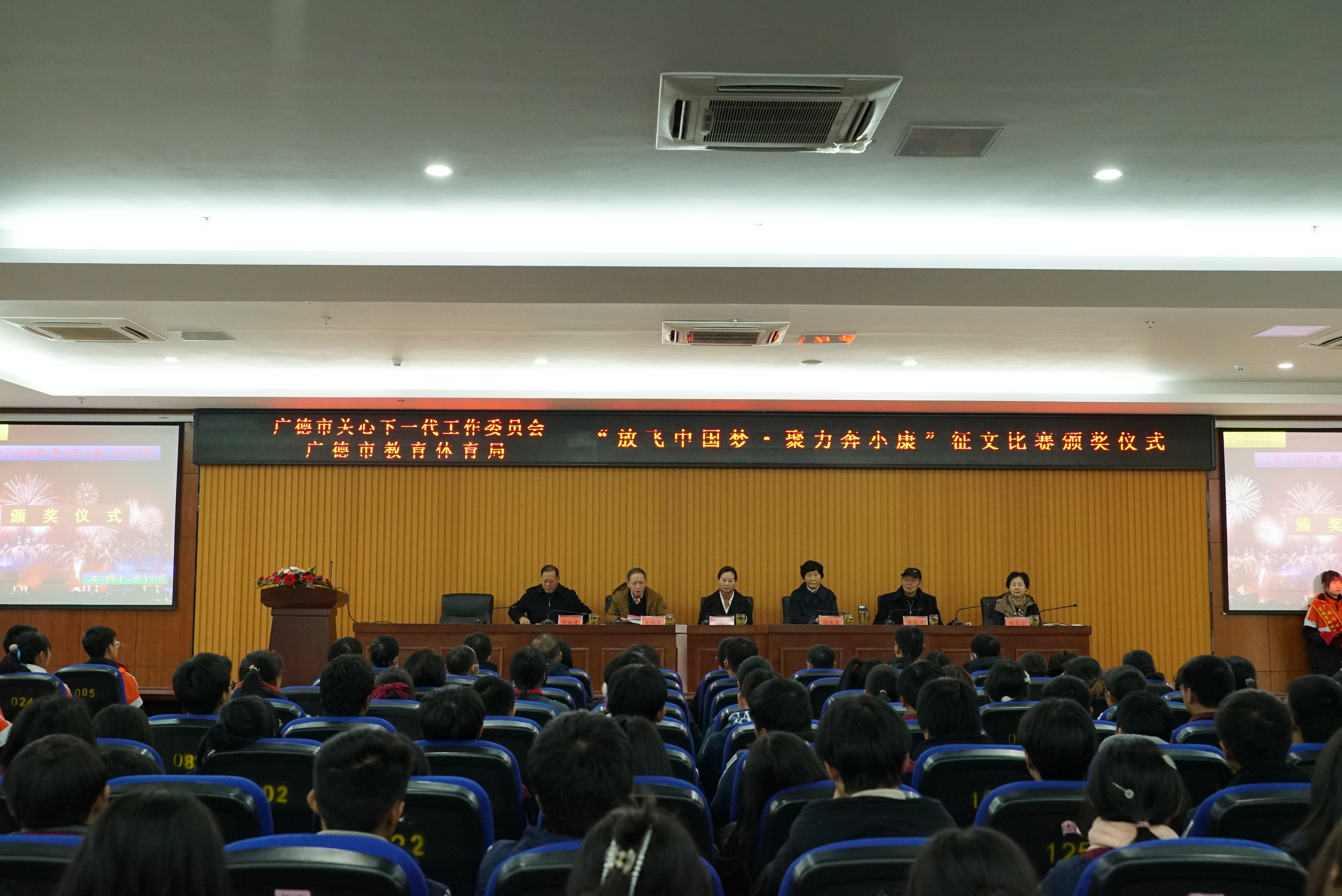 12月16日,由广德市关心下一代工作委员会、广德市教体局举办的“放飞中国梦•聚力奔小康”中学生征文比赛颁奖典礼在宣城市机械电子工程学校举行。广德市副市长江晓华,市关工委主任谭运秀,教体局党委委员程祖建,市关工委相关领导,市教体局关工委相关领导,宣城市机电学校党委书记、校长赖家荣出席了本次颁奖典礼。会议由市关工委副主任吴韵笙主持,参加活动的还有本次比赛的20余所学校的获奖学生和指导老师、机电学校各班学生代表近300人。