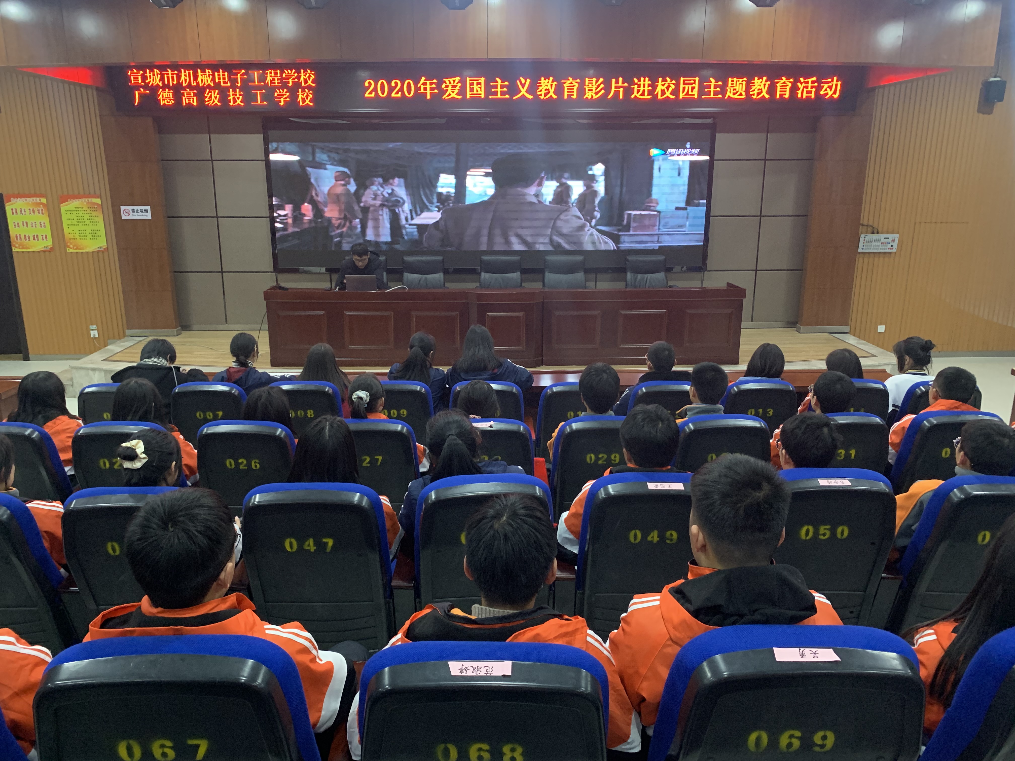 为大力弘扬爱国主义精神,12月21日晚自习,我校学生科组织19级、20级学生会干部、各班班长团支书,集中观看了爱国主义教育影片《八佰》。