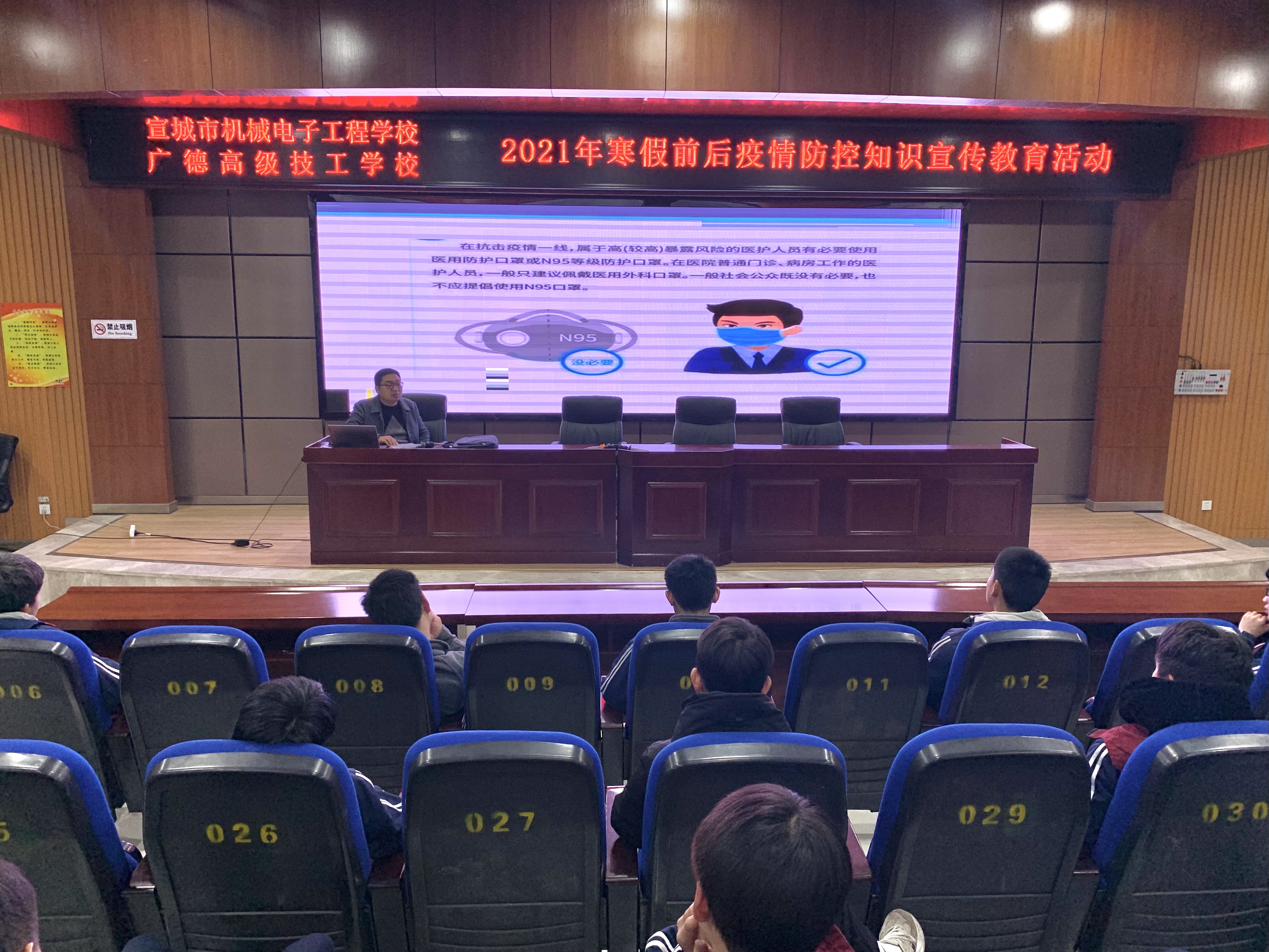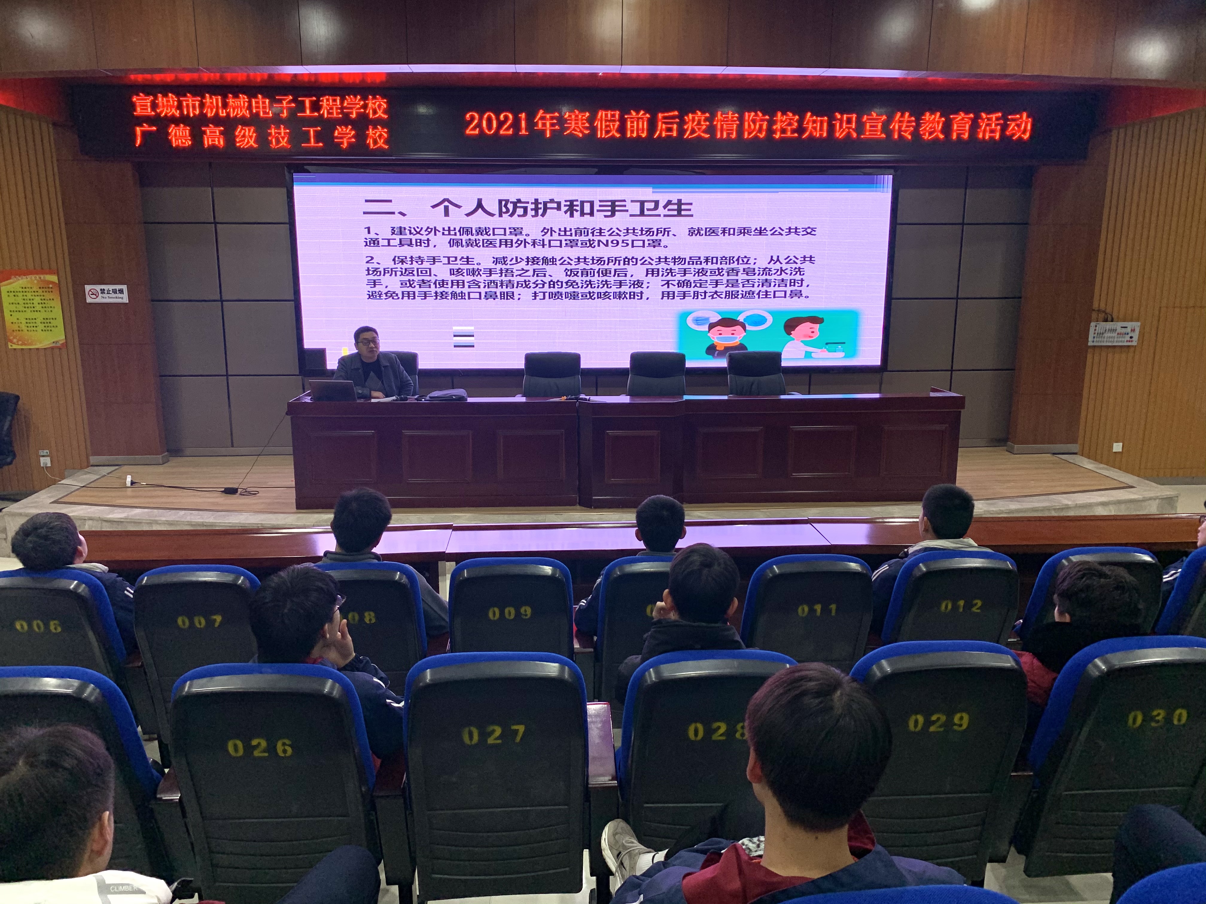 寒假将至,为了增强学生新冠疫情防控意识,1月20日晚自习,校学生科组织全体班长开展寒假疫情防控知识讲座,学生科副科长章银照主讲。