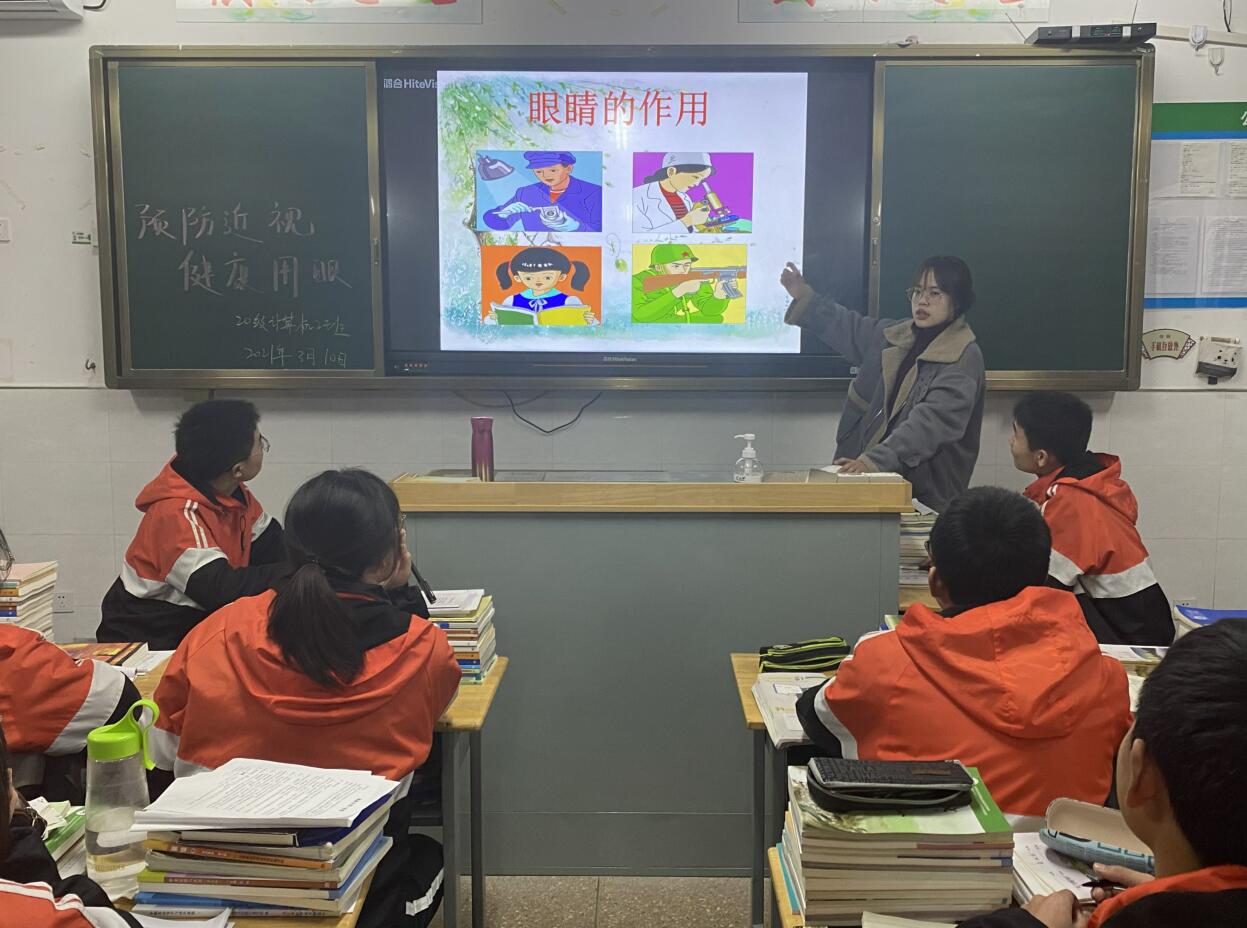 章银照围绕“预防近视 健康用眼”的主题,讲解护眼小知识,强调要保持充足的睡眠,看书看手机要保持一定的距离,长时间用眼睛后应到户外去活动,保持正确的读写姿势,坚持做好眼保健操。
