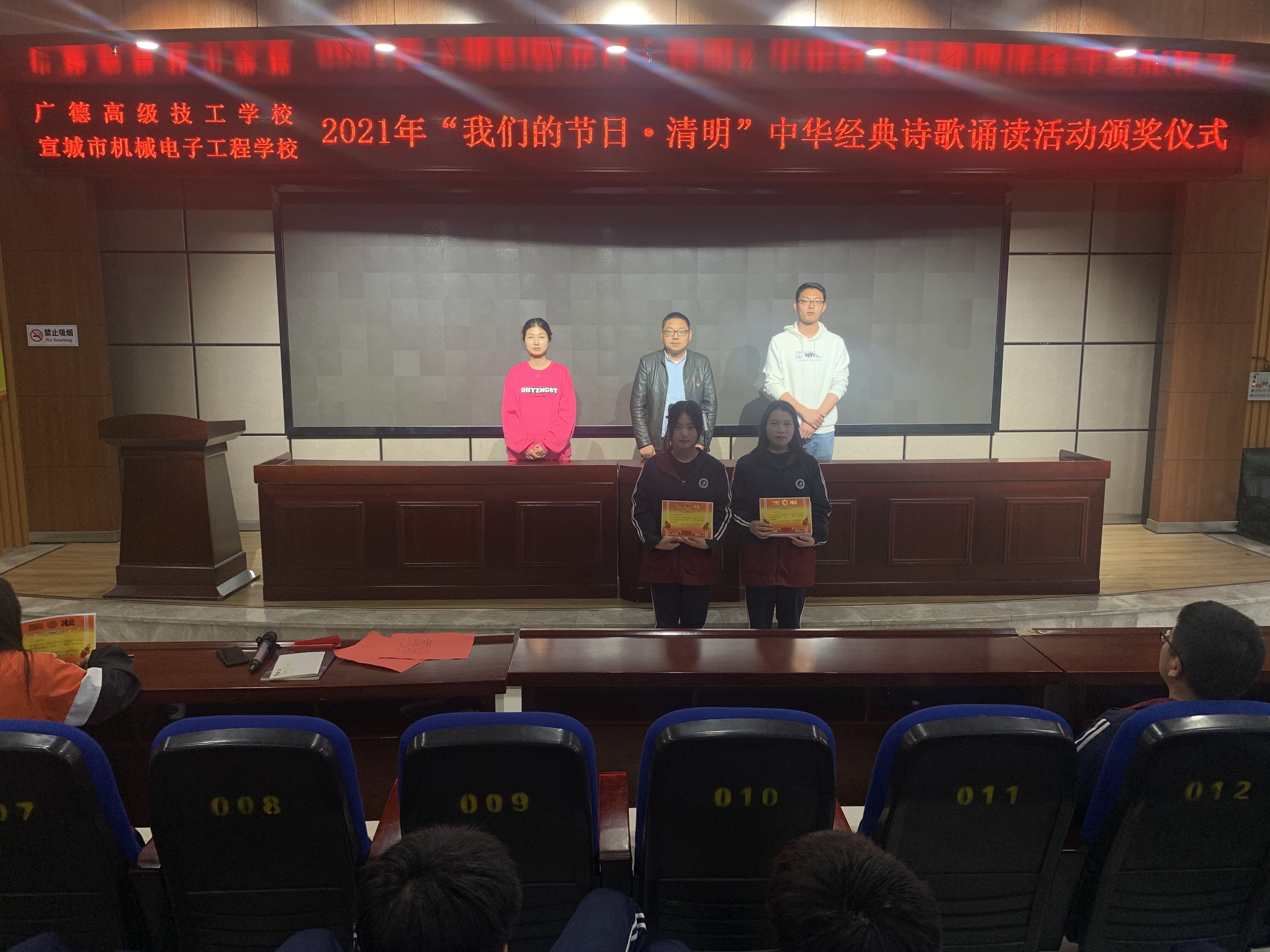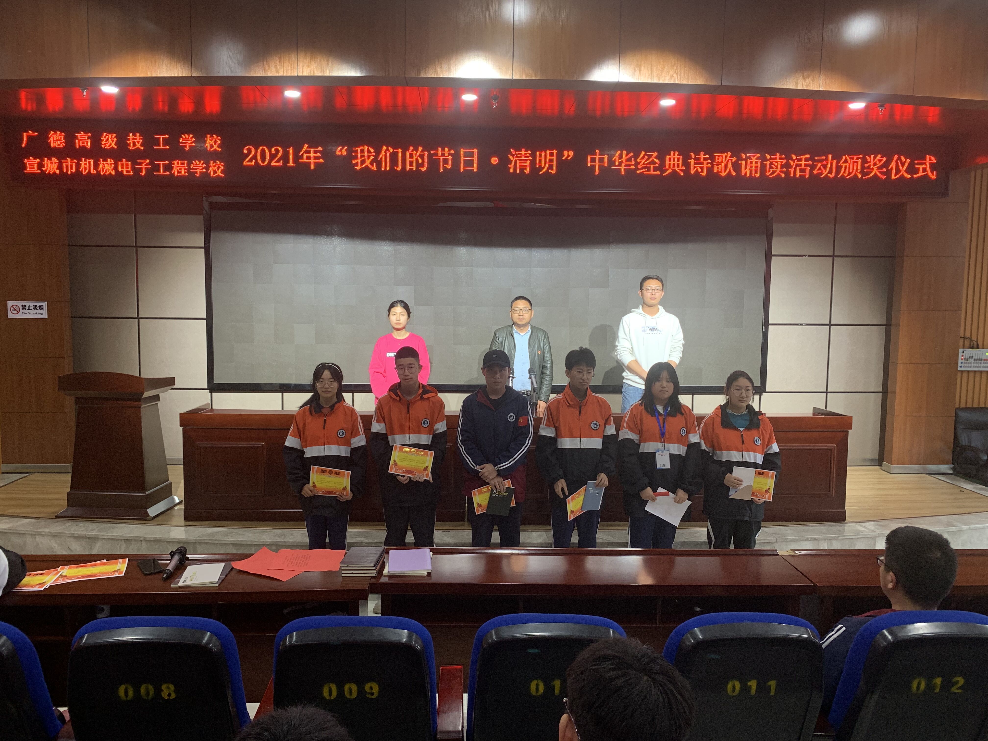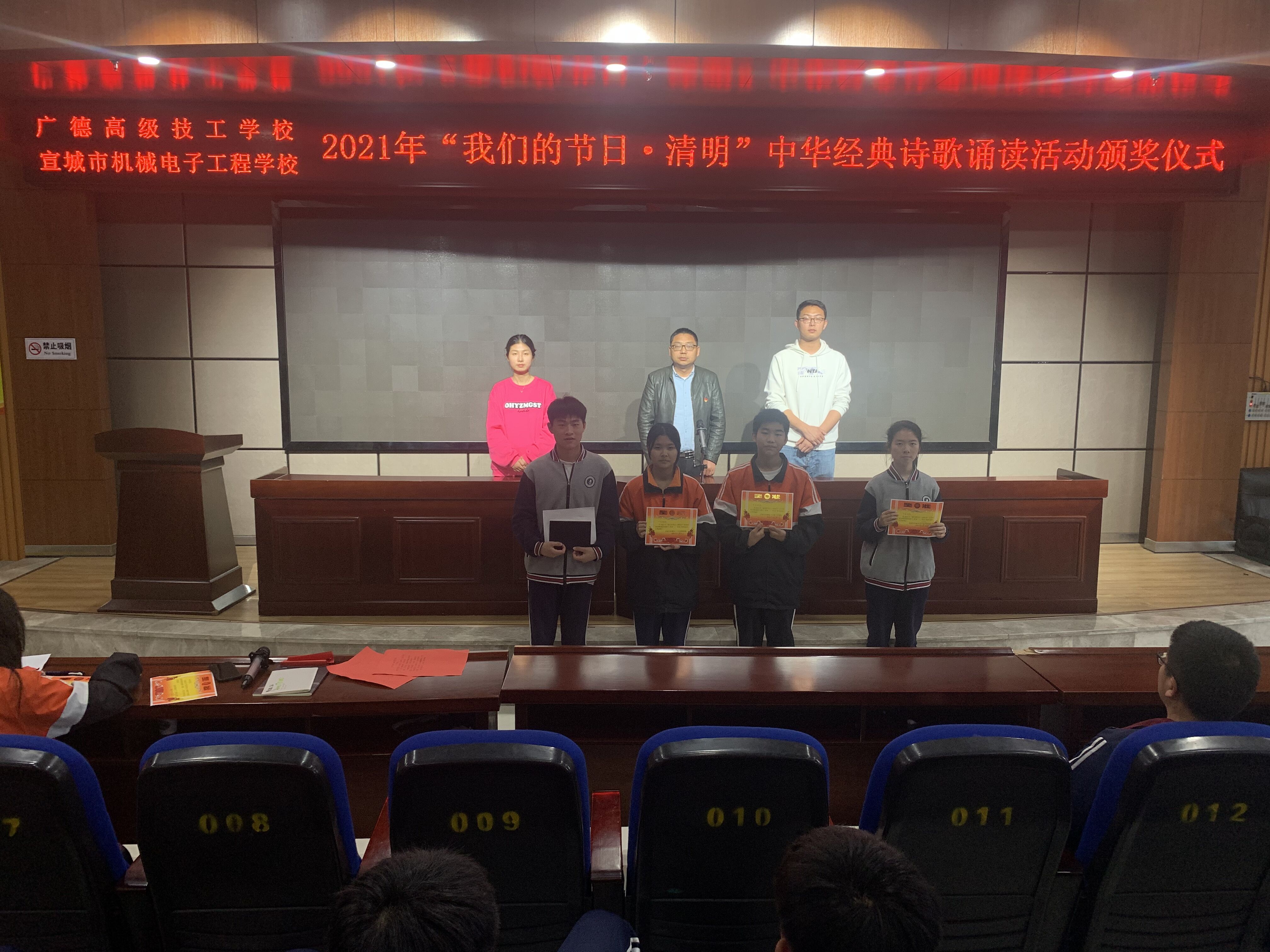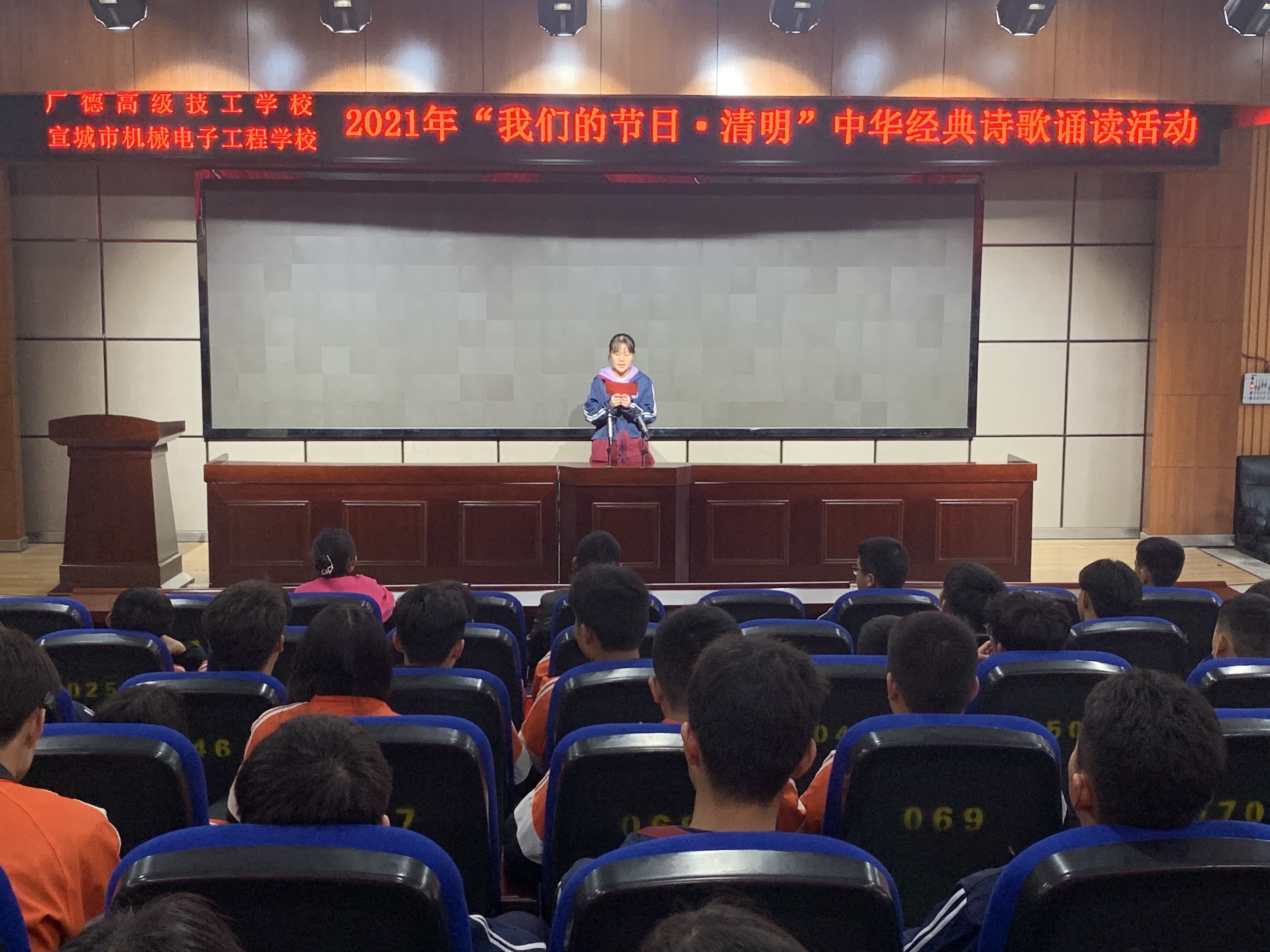 为缅怀先烈,弘扬传统文化,3月31日下午,宣城市机电学校“我们的节日·清明”诗歌诵读活动在学校信息楼一楼报告厅举行。校学生科负责人章银照、团委书记李君璐及部分学生共100余人观看了节目。
