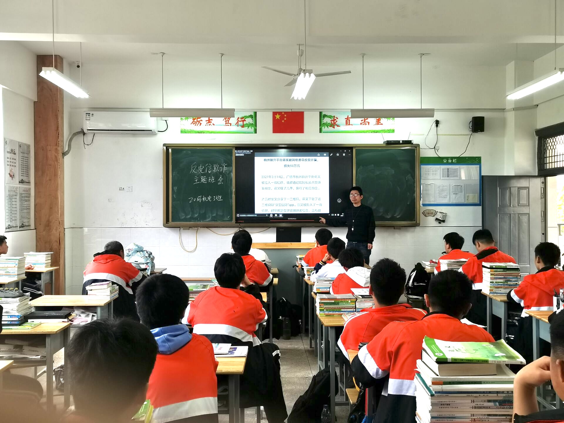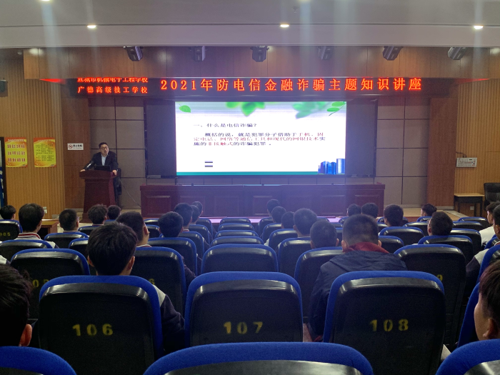 为进一步提升师生的自我防范意识,增强防范网络诈骗的能力,保障人身财产安全,5月9日晚自习时间,宣城市机电学校联合广德市电信公司开展防电信诈骗安全教育活动,各班班长参加活动,学生科负责人章银照主讲。