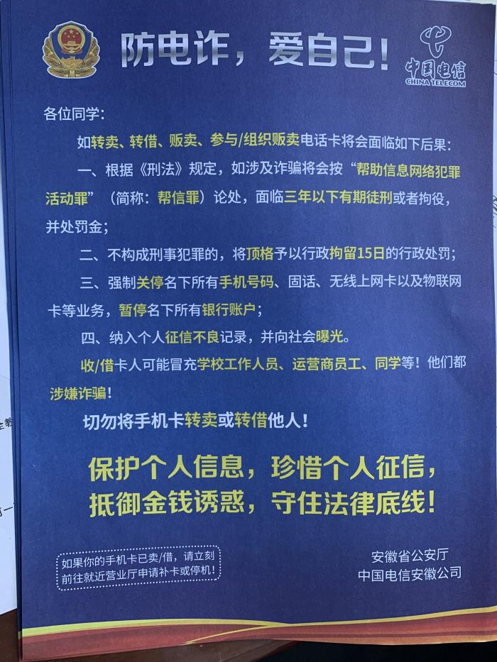 此次防范和打击电信诈骗宣传教育活动,旨在增强广大师生法律意识和防范意识,引导广大师生和家长科学防范电信诈骗,切实提高师生员工防范意识与防范能力,为打击网络电信诈骗、共建和谐校园奠定了基础。(程明)