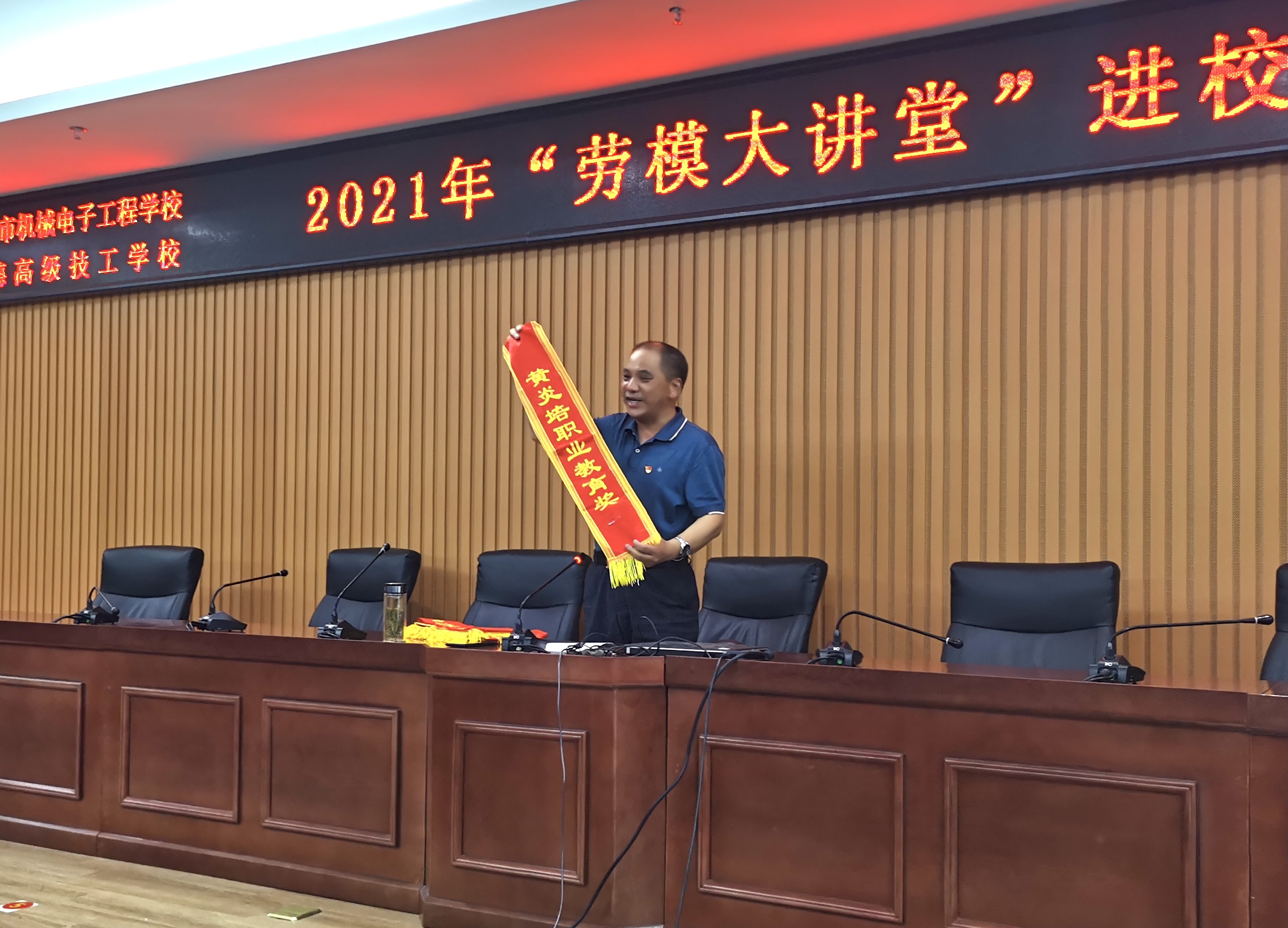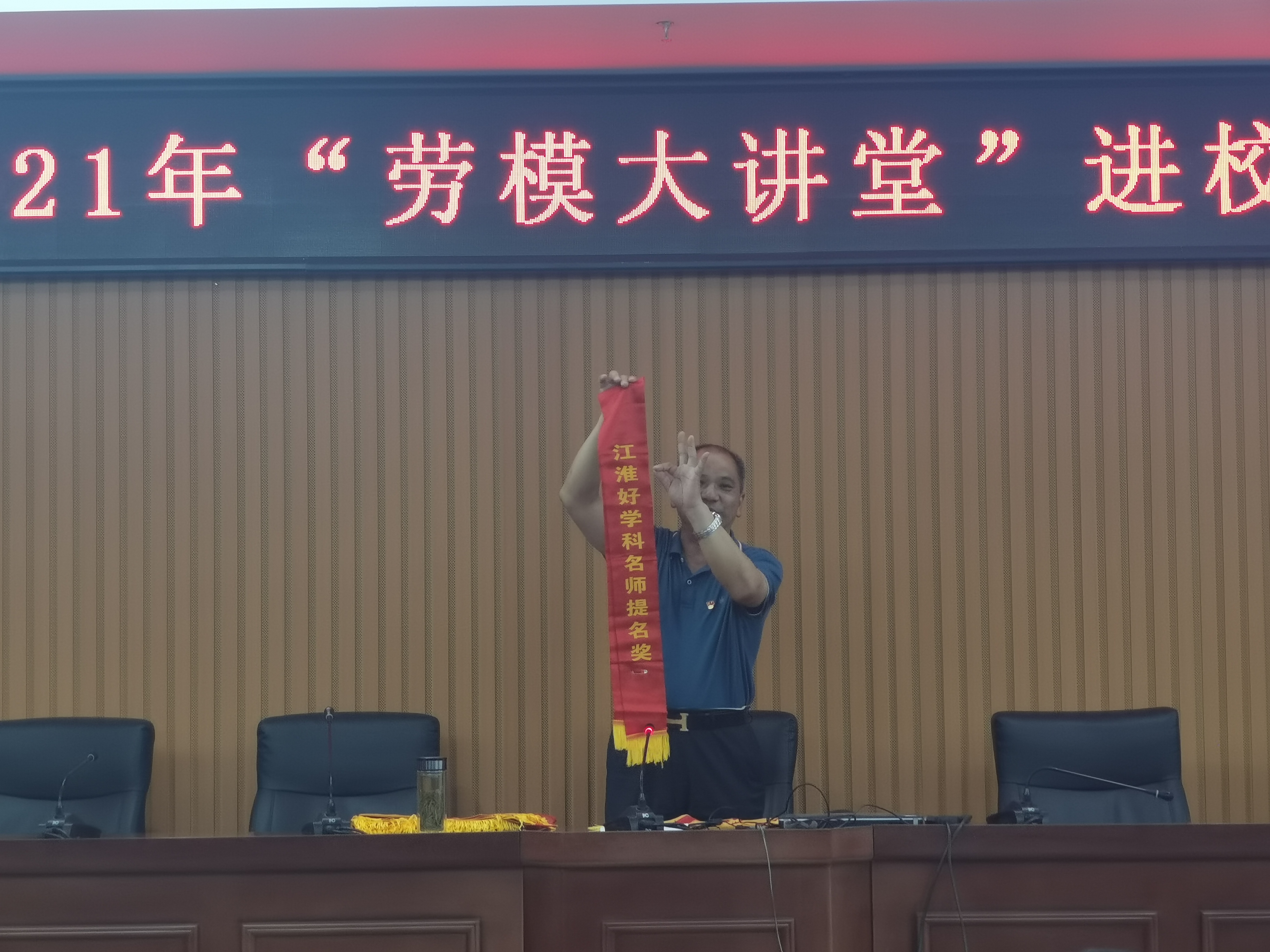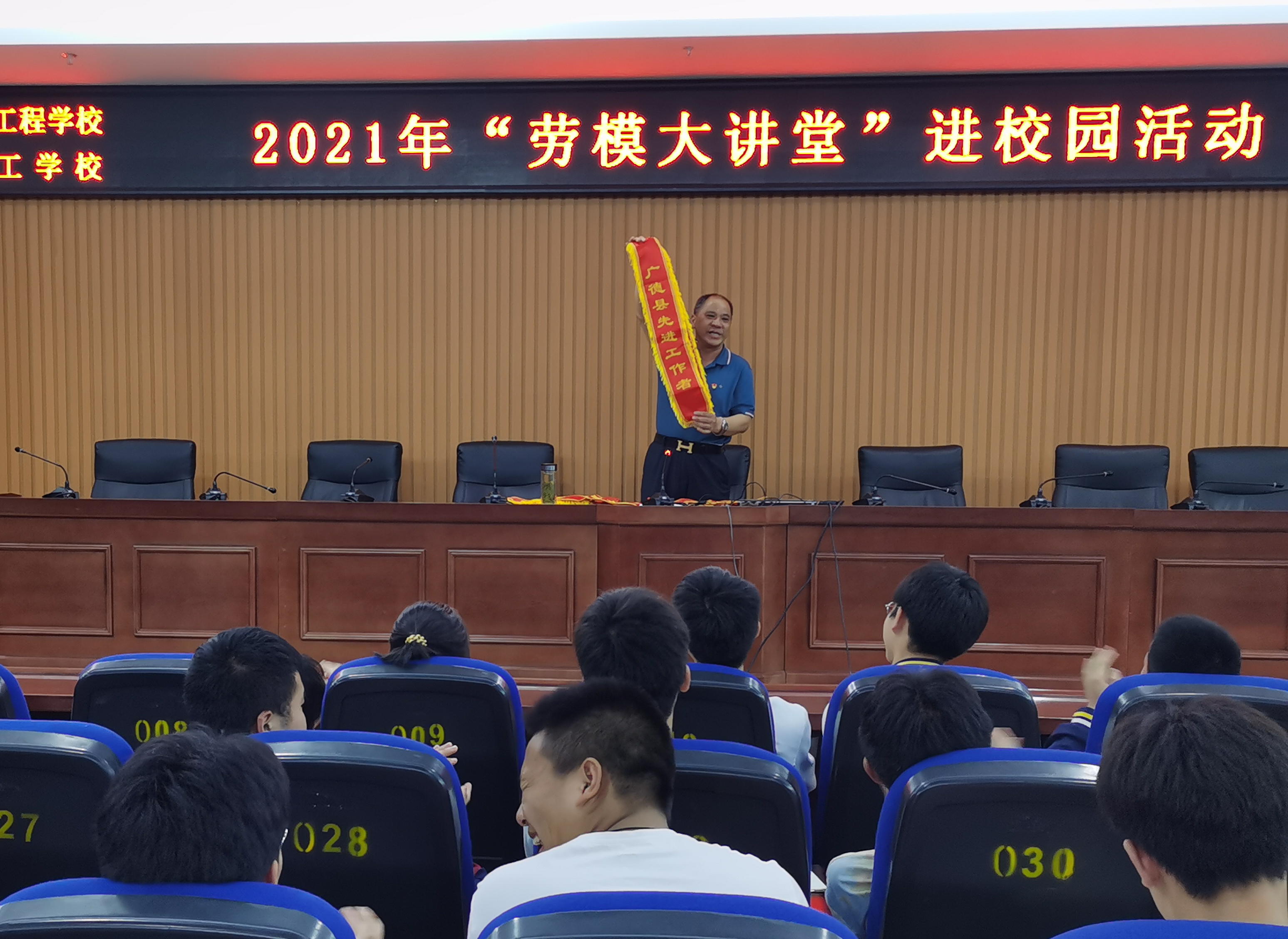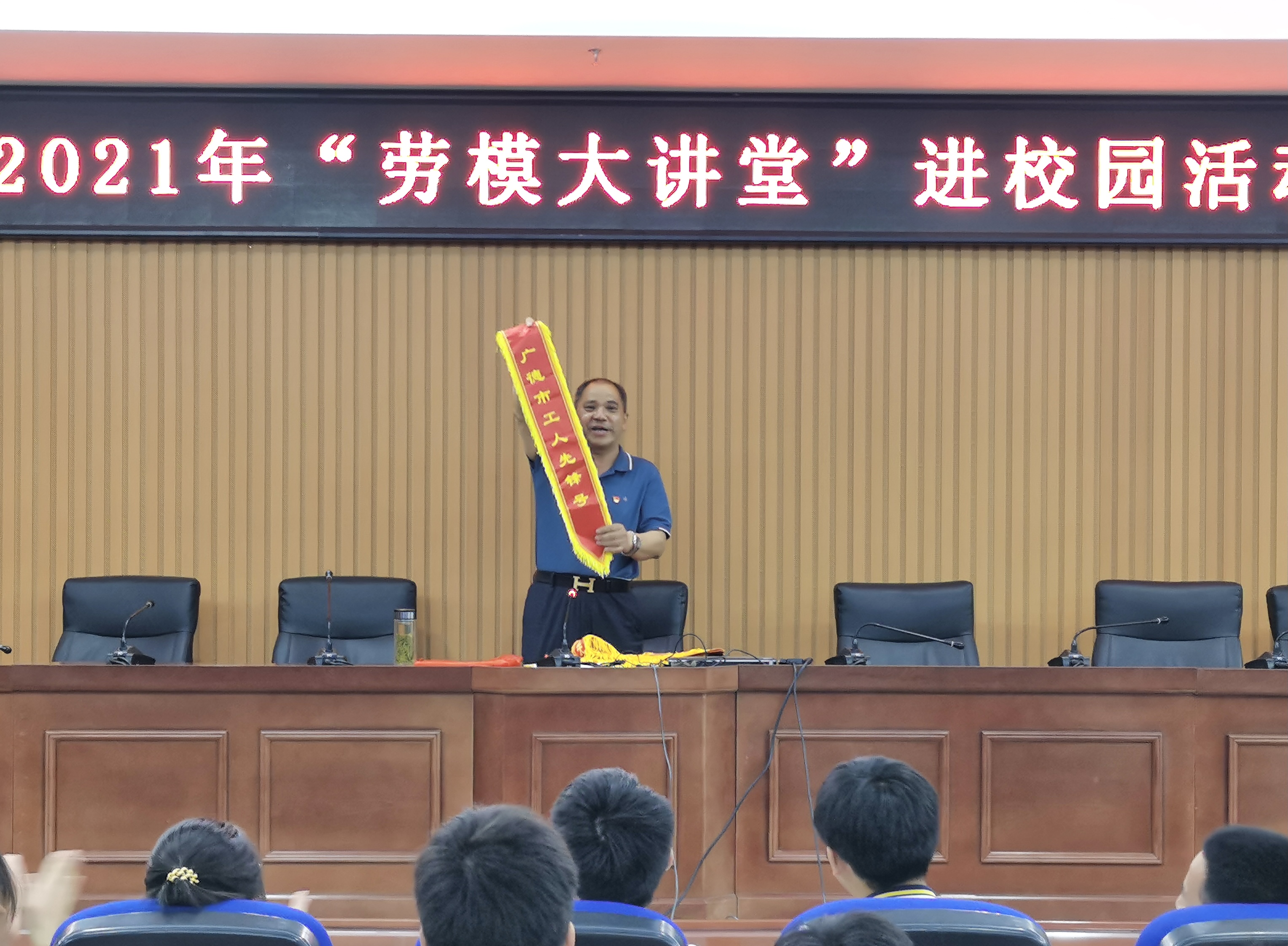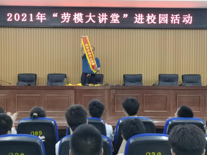 报告会结束前,王海安老师将一条条鲜红的绶带一一展示给大家,学生报以热烈的掌声和欢呼声,现场气氛将报告会推向了高潮。他鼓励并号召全体同学要珍惜时光,脚踏实地,埋头苦干,崇尚劳动,热爱生活,做一个矢志不渝、敢为人先、勇于创新的新时代青年。