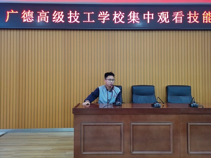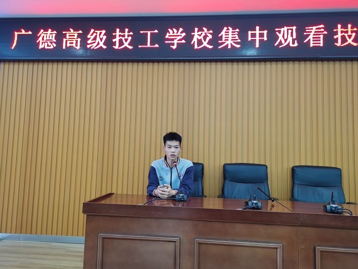 报告会结束后,章银照说,五名获奖选手的先进事迹报告催人奋进,同学们要把学习技能本领作为首要任务,用汗水和泪水浇灌技能梦想,努力增长自己的本领,为将来为国增光打好基础。20级机电1班汪旭同学看完报告后说,直播中哥哥姐姐们的一席话,句句直击我的心灵,他们同样都是寒门子弟,但凭借自己的刻苦钻研,让本不起眼的技艺走出中国,通向世界的艺术殿堂,我们也要好好学习,也为祖国发展尽一些绵薄之力。20级机电1班周培俊同学看完报告后说,看完直播后,我深受感触,以后也要像他们学习,认真学习技能,以技能报效祖国。在以后的上实训课时,要不怕苦不怕累,认真完成老师布置的任务,希望自己以后也能能像这些优秀的选手一样以技能报效祖国。19级数控2班胡庭俊同学看完报告后说,看完直播后,我感觉有自豪有骄傲,自豪是他们给我们的祖国在世界技能的舞台上实现了金牌零的突破,让我们技能人才能在世界大方光彩。骄傲是我可以亲切的叫他们一声师哥师姐,我和他们一样都是技工学校的学生,我要努力也可以为祖国带来骄傲。