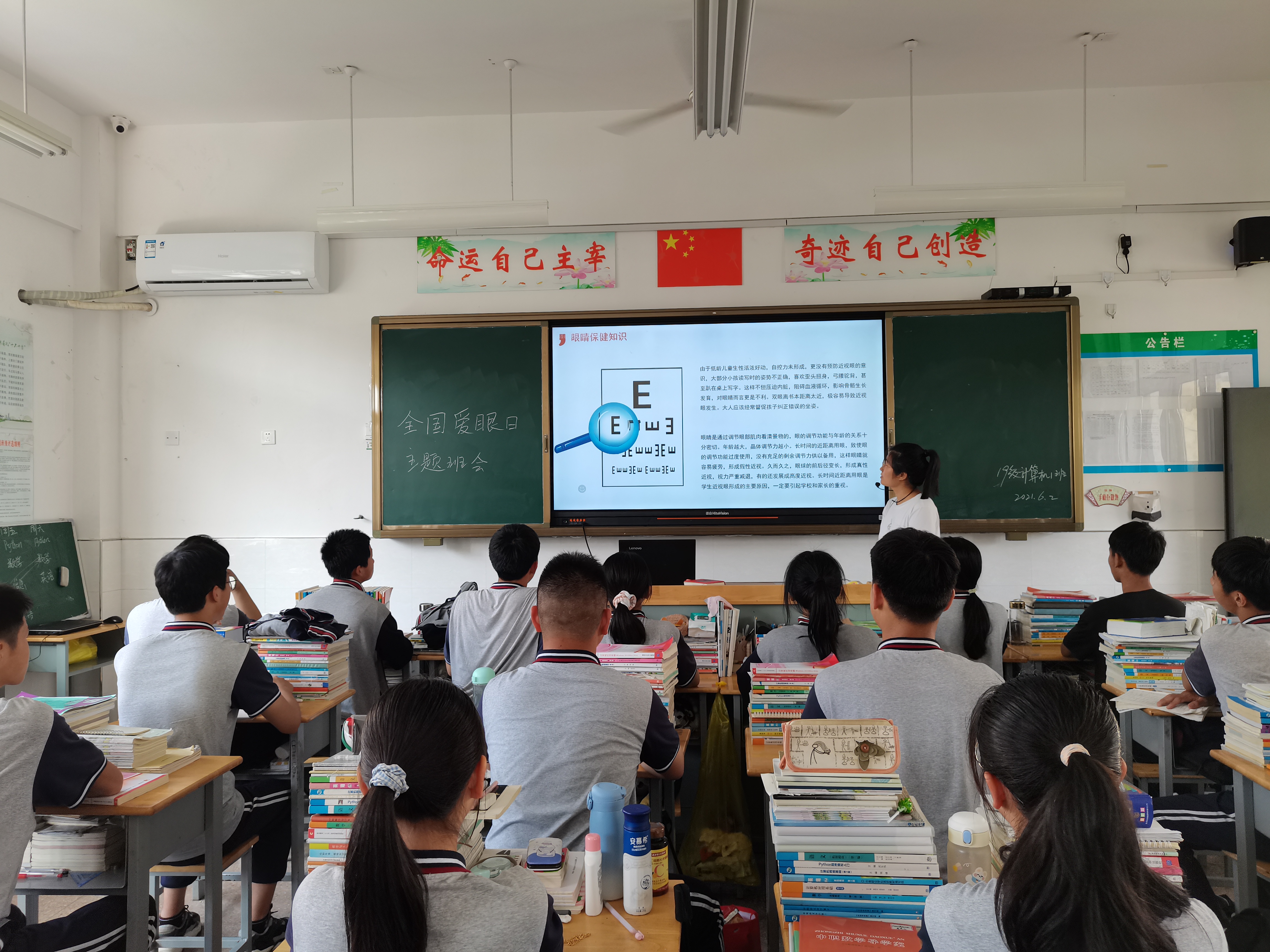 讲座结束后,各班开展爱眼护眼主题班会,班主任通过内容详实的多媒体课件,从近视原因、如何预防、健康用眼、均衡饮食、定期检查等方面进行细致讲解,并与学生互动,耐心解答同学们提出的在日常生活、学习中遇到的视力方面的问题,让学生从根本上了解了健康用眼的重要性,并自觉重视对眼睛的保护。