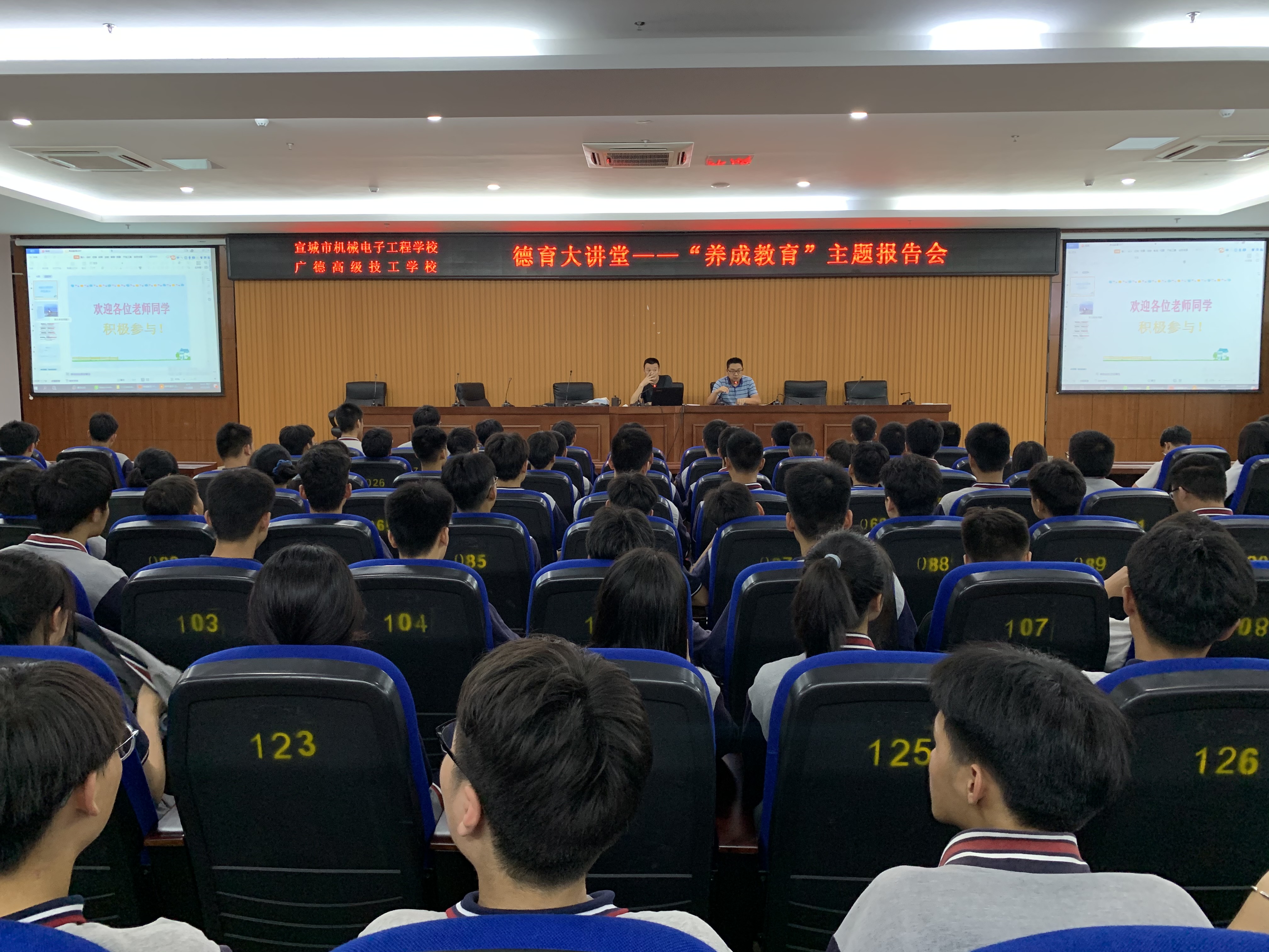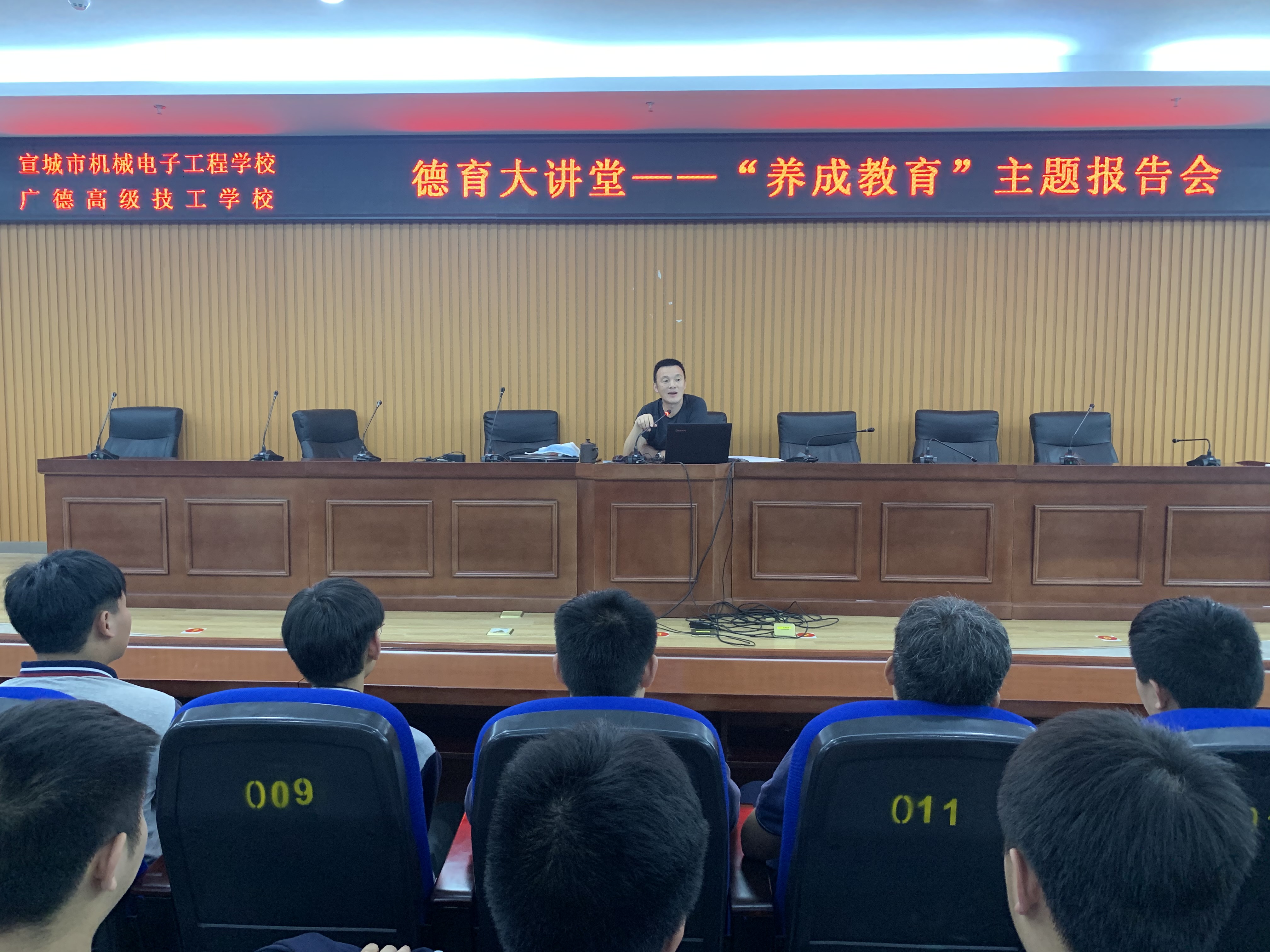 为促进学生养成良好的行为习惯,6月6日晚,宣城市机械电子工程学校(广德高级技工学校)在图书信息中心二楼报告厅举办2021年宣城市机械电子工程学校(广德高级技工学校)德育大讲堂——养成教育专题讲座。讲座由该校学生科负责人章银照主持,广德市名班主任简光军工作室主持人简光军主讲。广德市名班主任简光军工作室成员王宁宁、王道群、部分青年教师、各班学生干部近300人参会。