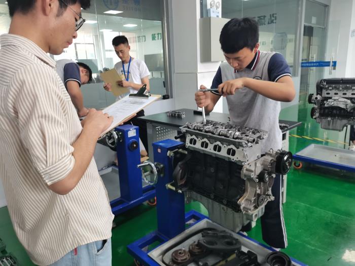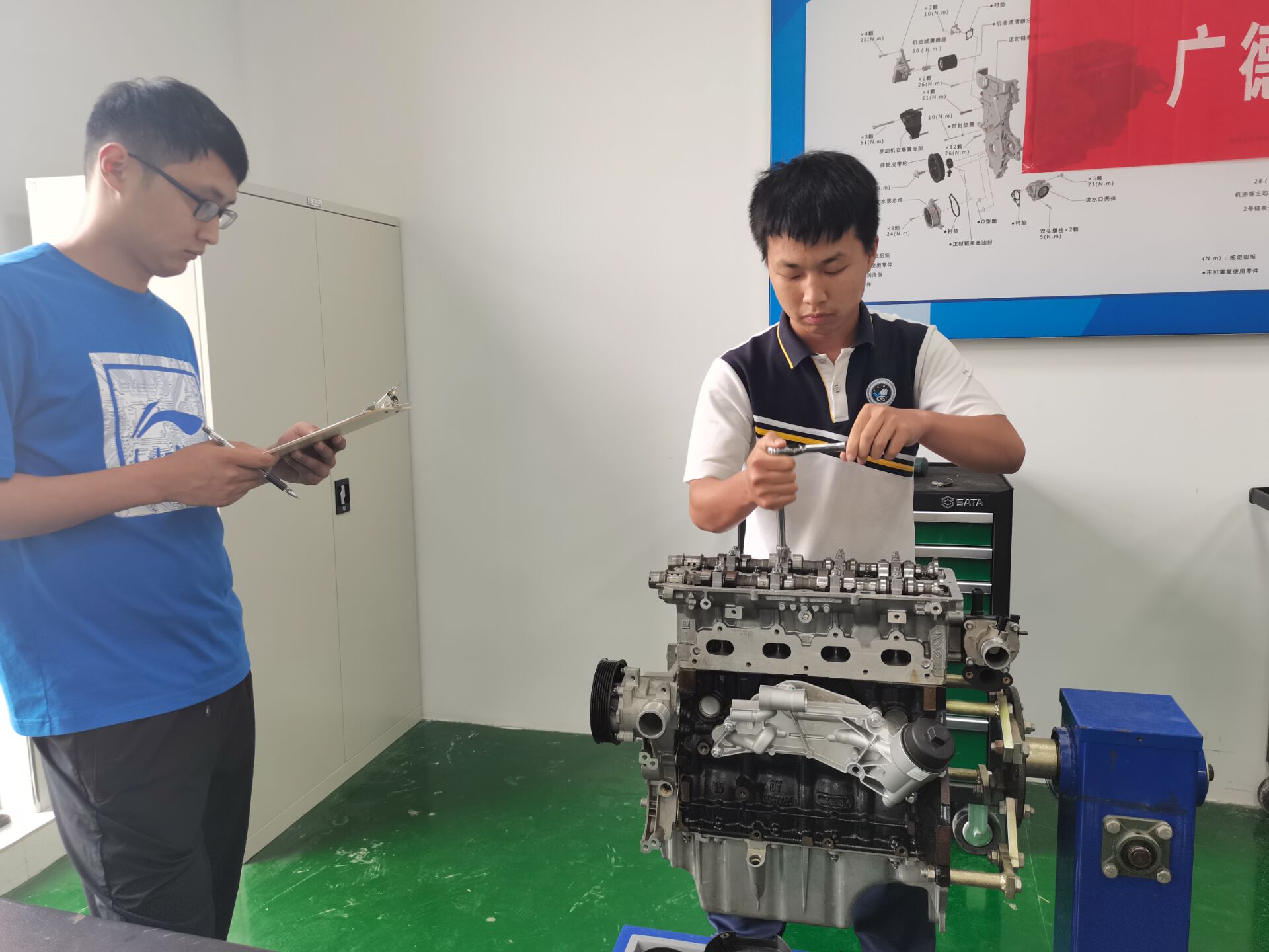 本次竞赛项目是凸轮轴的拆装。在班主任的带领下,参赛学生有序入场,裁判老师示意开始后,参赛学生按照要求拆装凸轮轴,裁判分别从安全与准备工作、拆卸与检查、安装与检查、安全文明生产等四个方面进行评分。重点观测学生赛前工具检查、凸轮轴轴承盖的拆卸、凸轮轴轴径等。在整个比赛过程中,选手们争分夺秒、全神贯注、拆装迅速、取放工具井然有序。活动现场气氛热烈,选手们的精彩表现更是赢得了老师和同学们的称赞。
