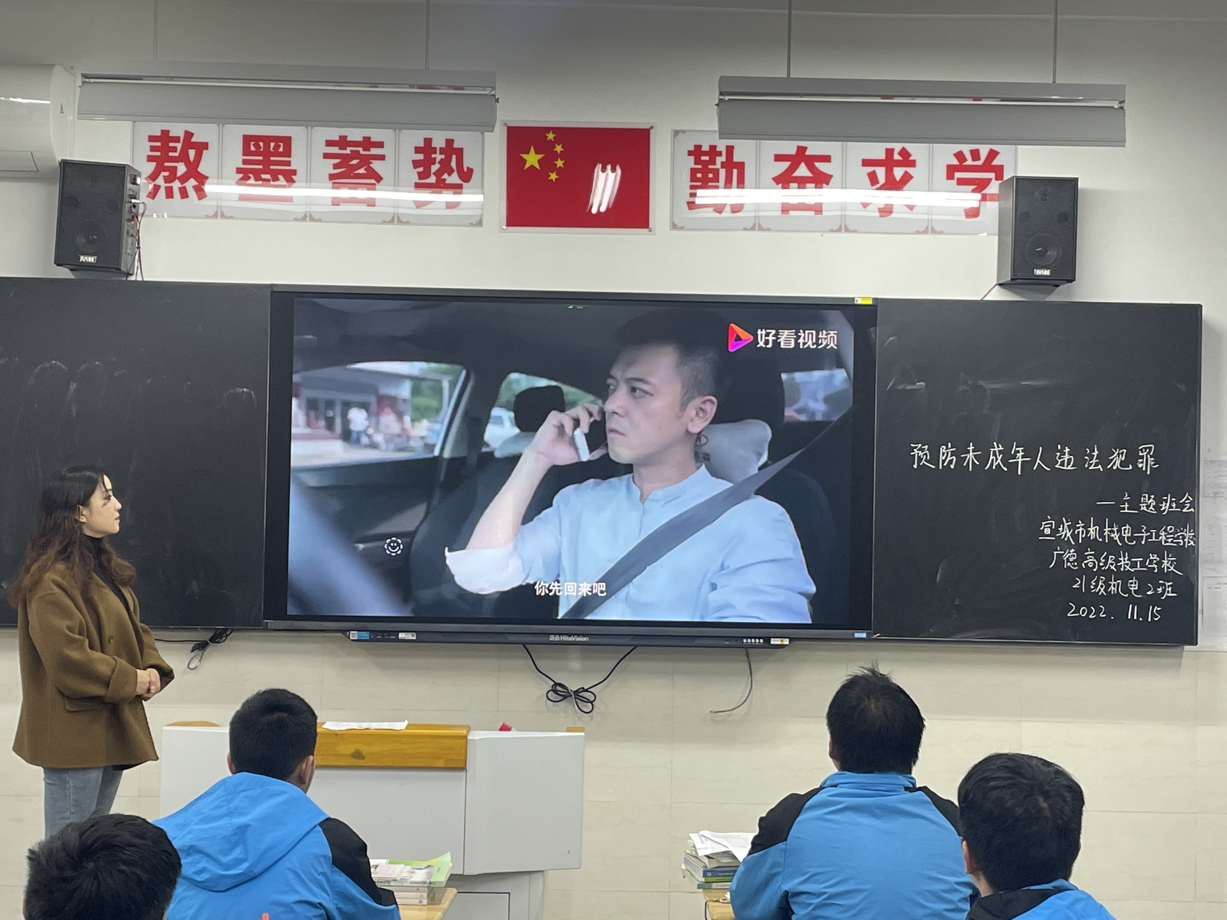 为提高学生的安全意识和对法律的认识,增强学生法治观念,护航青少年健康成长,11月15日下午,宣城市机械电子工程学校(广德高级技工学校)召开“预防未成年人违法犯罪”主题班会,宣传相关的法律、法规知识。