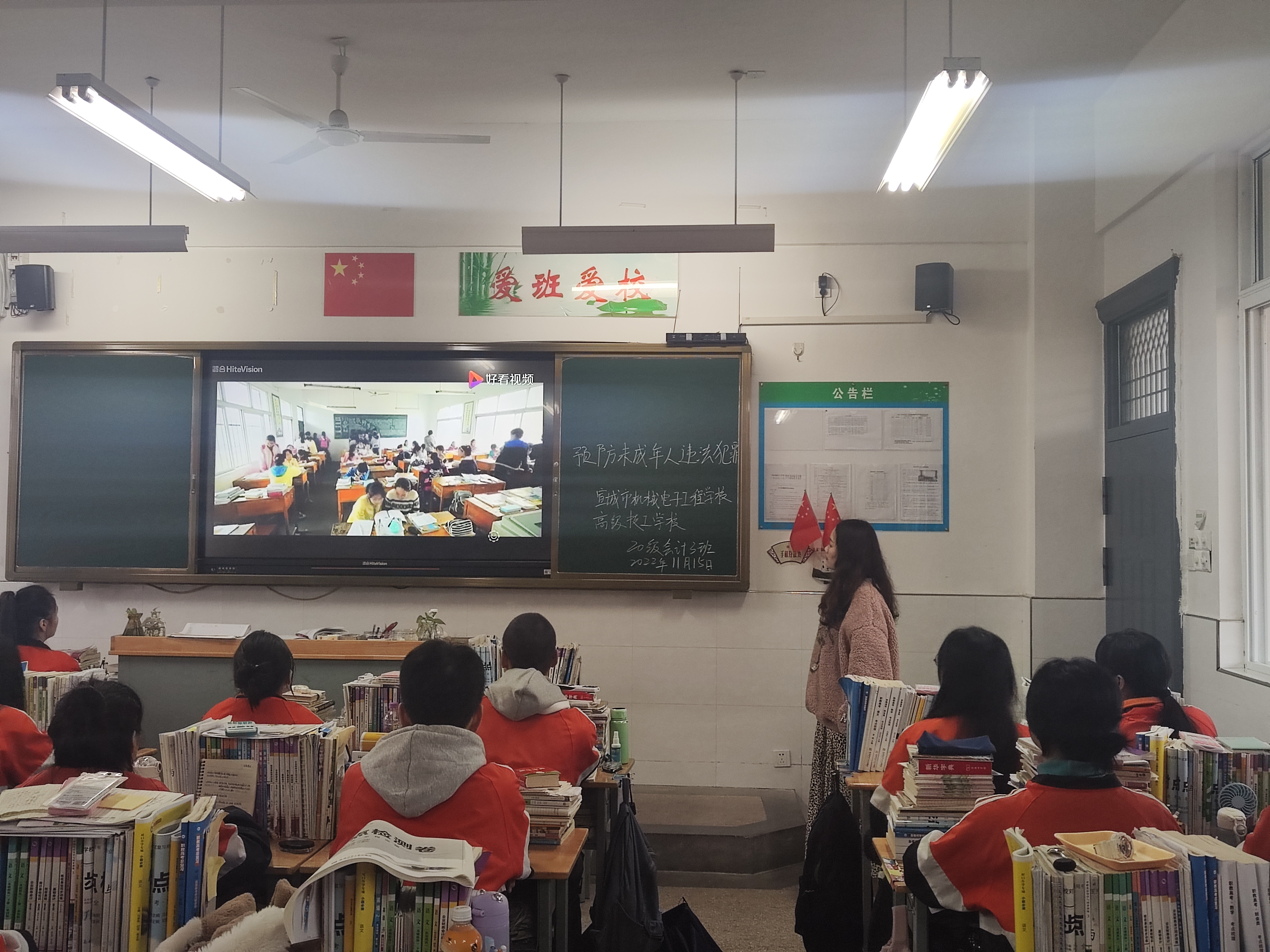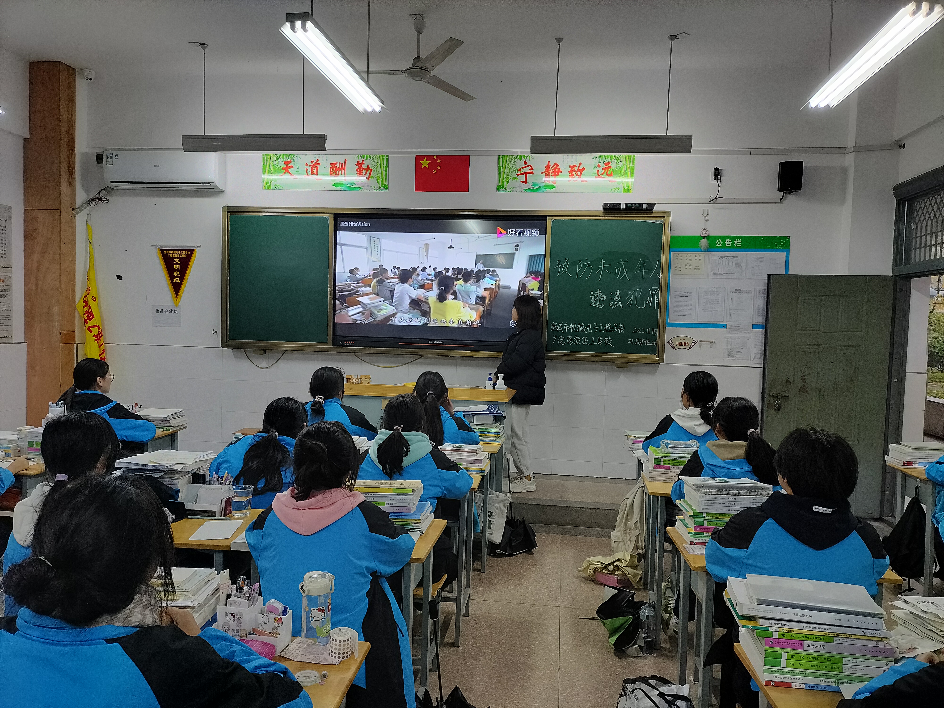 主题班会主要从“犯罪和我们有什么关系?”“未成年人的哪些行为属于违法?”“什么是犯罪?”“违法和犯罪的关联?”“不良行为和严重不良行为的区别?”“我们要怎么做?”这五个方面展开,利用视频向同学们介绍青少年有组织犯罪的特征,引导学生了解未成年人不良行为的种类,组织学生从道德两难的心理方面对案例进行分析与判断,让学生们理解一般违法与有组织犯罪的区别和联系、导致青少年犯罪的主观原因。