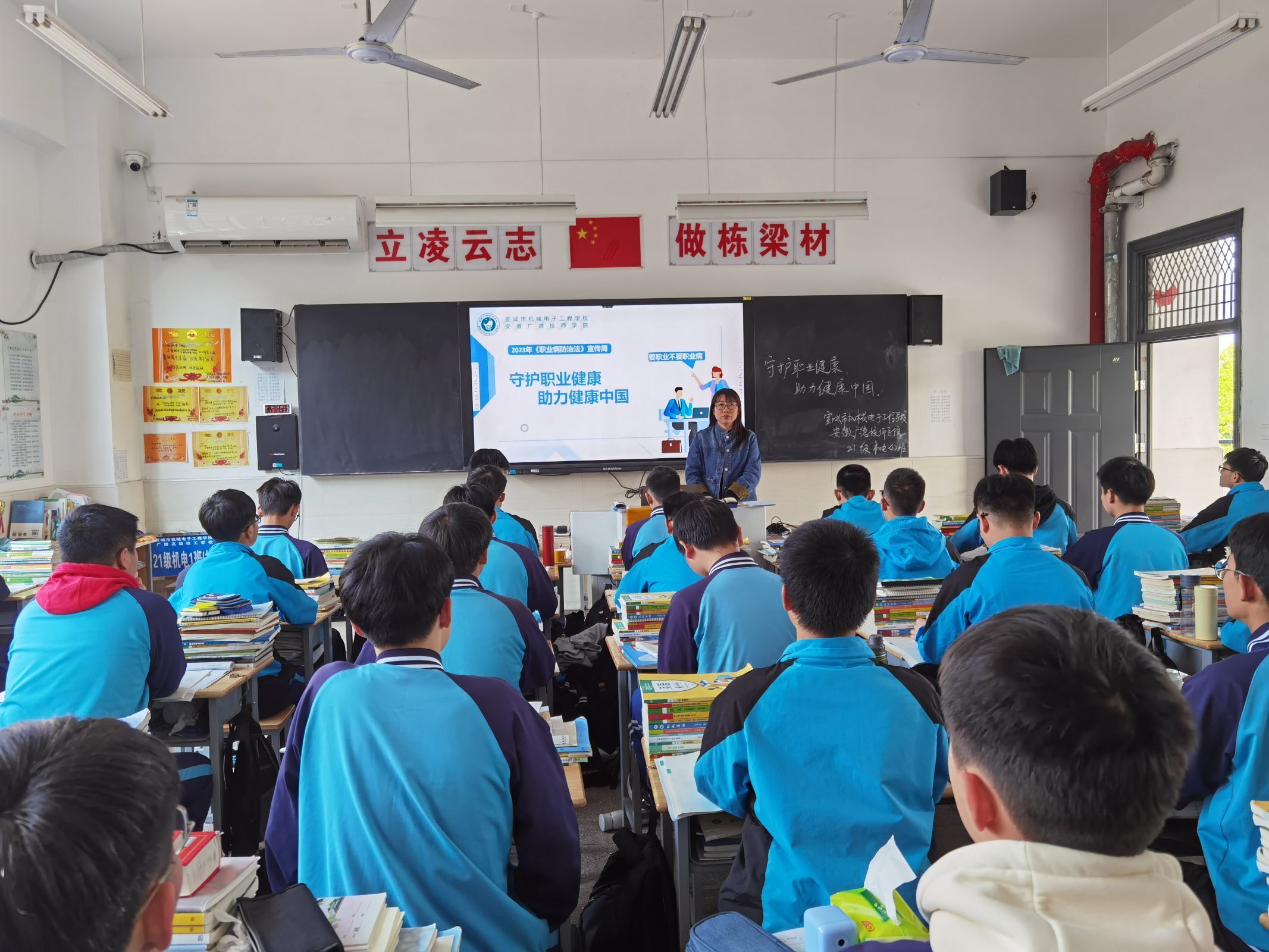 今年4月25日至5月1日是第21个《中华人民共和国职业病防治法》宣传周,今年的活动主题是“改善工作环境和条件,保护劳动者身心健康”。为提高学生的职业健康意识,将来走向工作岗位能够依法维护自身的合法权益,4月26日下午,宣城市机械电子工程学校(安徽广德技师学院)召开以“守护职业健康,助力健康中国”为主题的职业病防治班会。