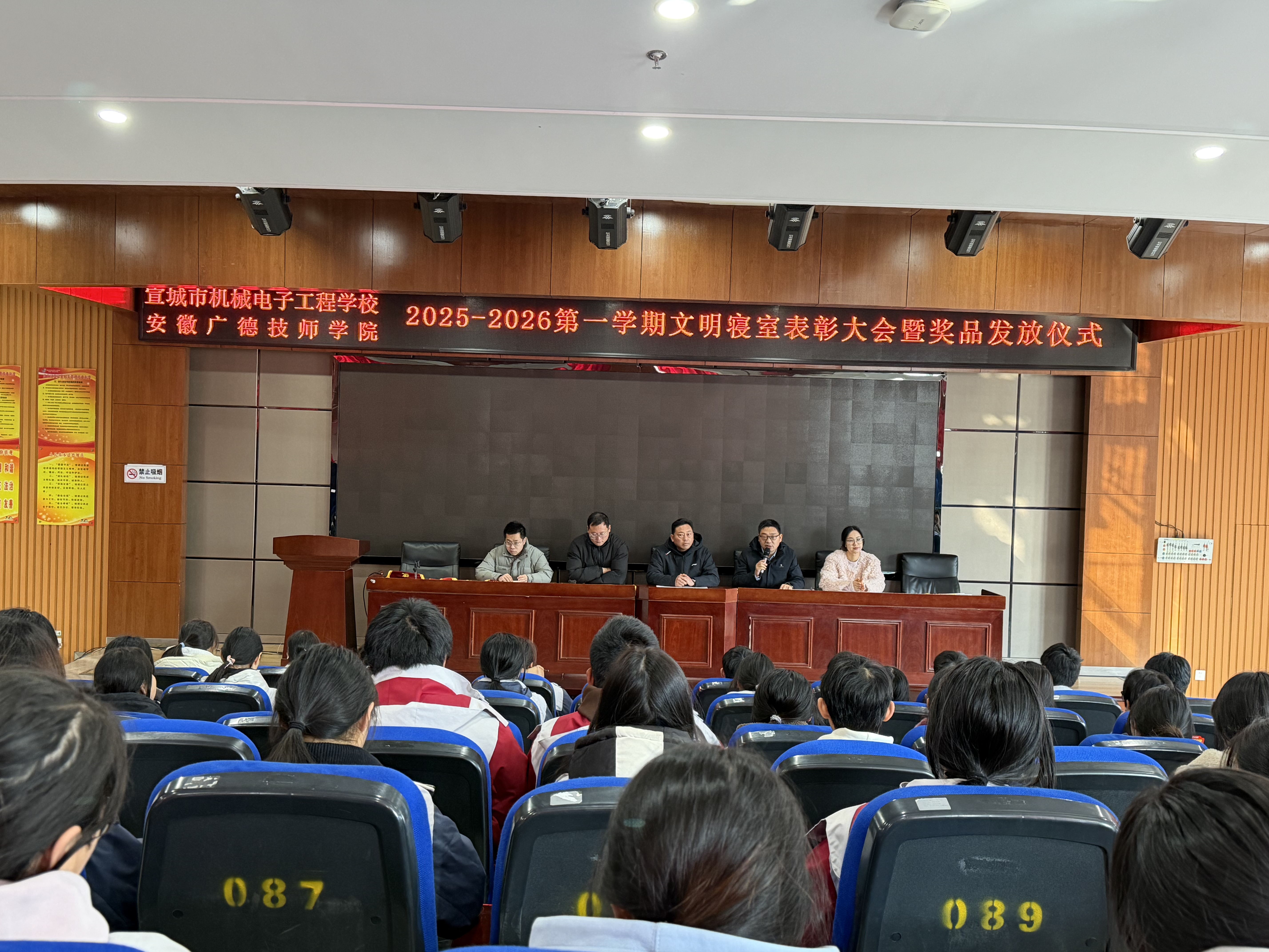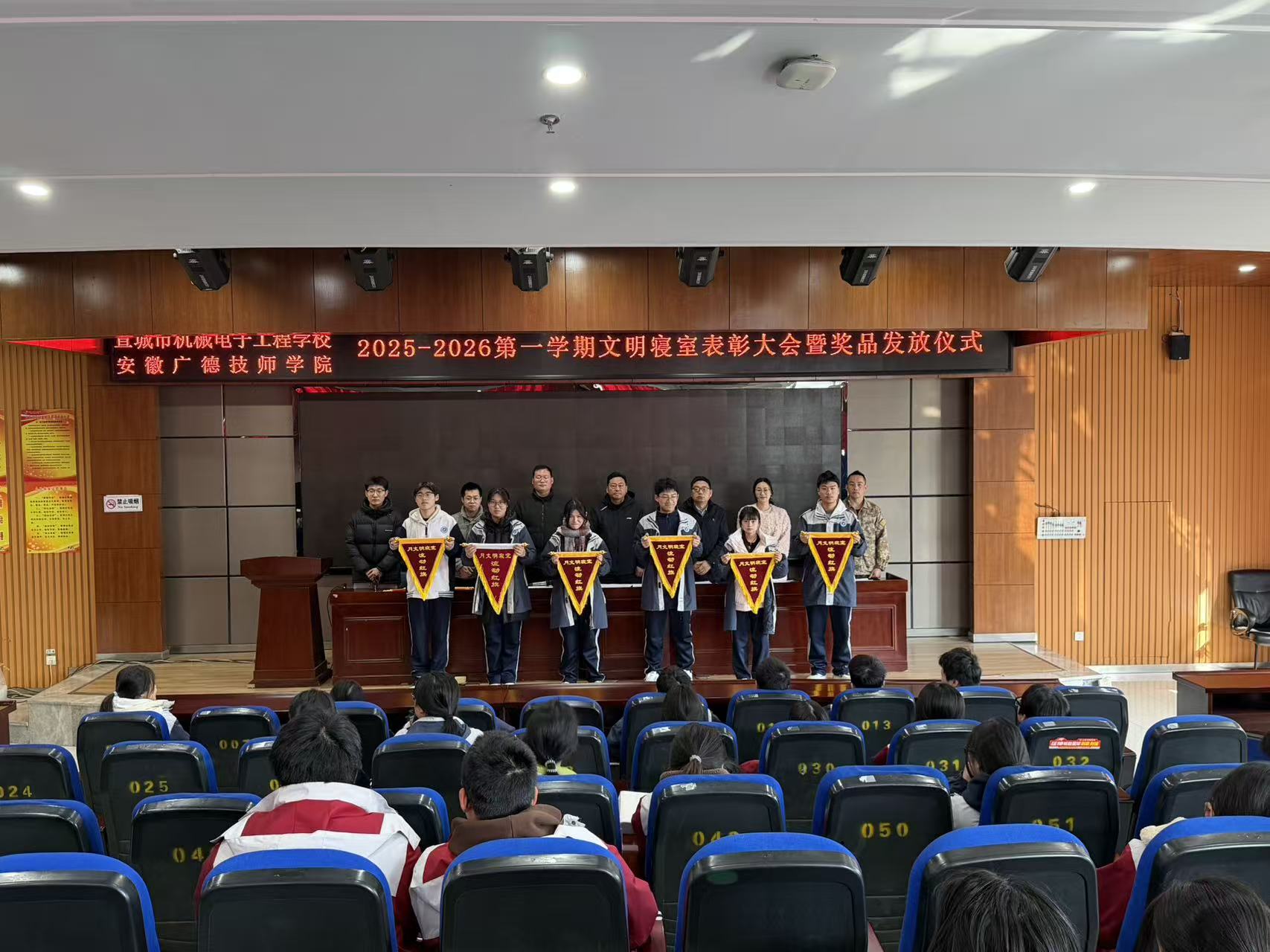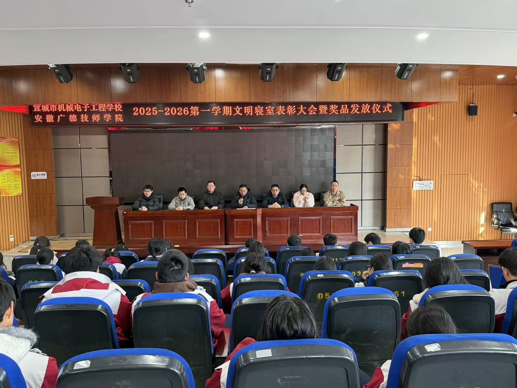 为深入推进校园文明建设,营造整洁、和谐、有序的寝居环境,充分发挥先进典型的示范引领作用,1月16日上午,宣城市机械电子工程学校(安徽广德技师学院)在图书信息中心一楼会议室,召开2025-2026学年第一学期文明寝室表彰大会暨奖品发放仪式。校党委副书记、副校长杨林,学生处主任章银照,学生处副主任石洋,机电工程系部学管主任程明,商贸信息部学管主任易诚成出席大会,各班级学生代表及受表彰寝室成员参加大会。