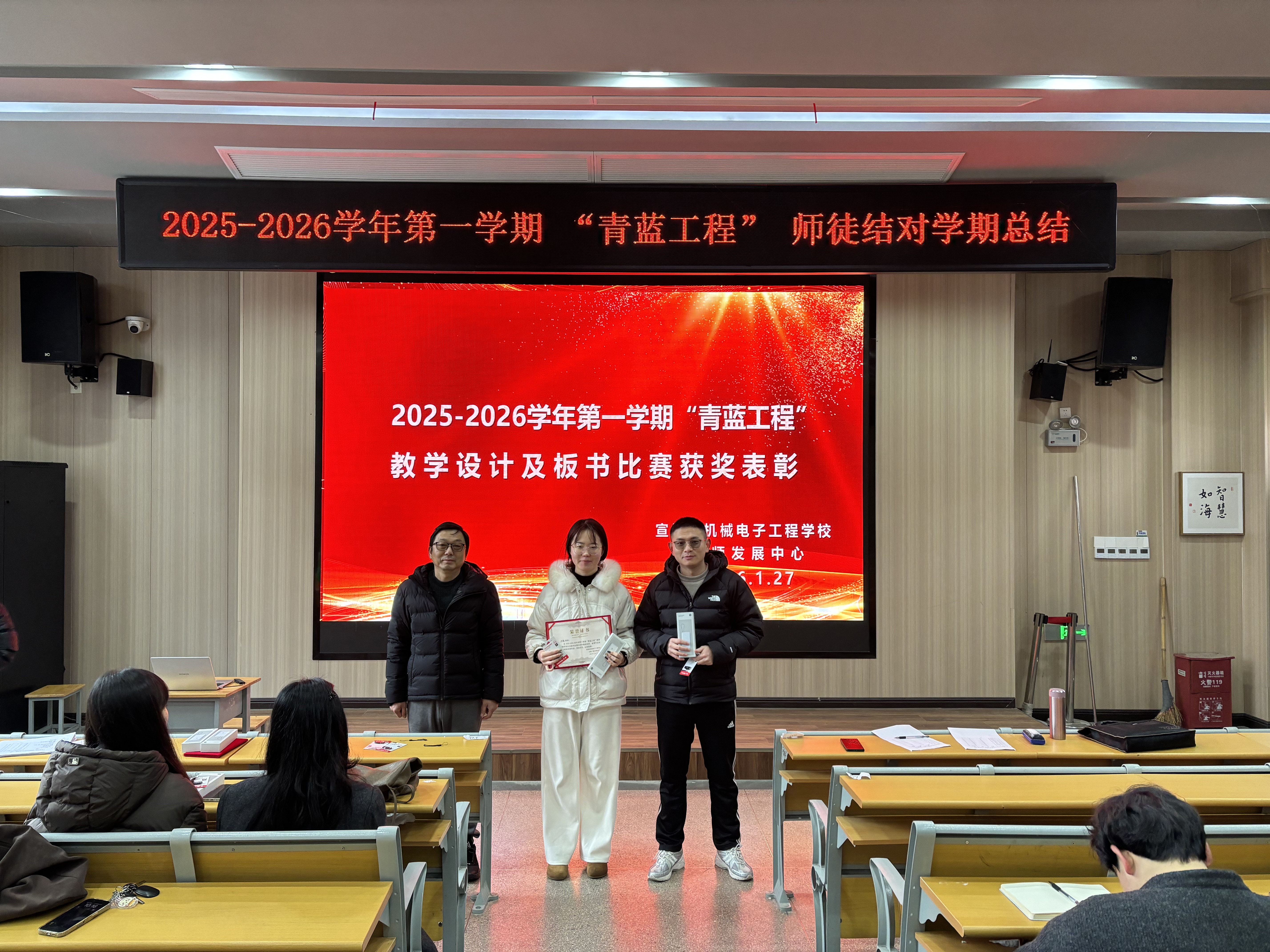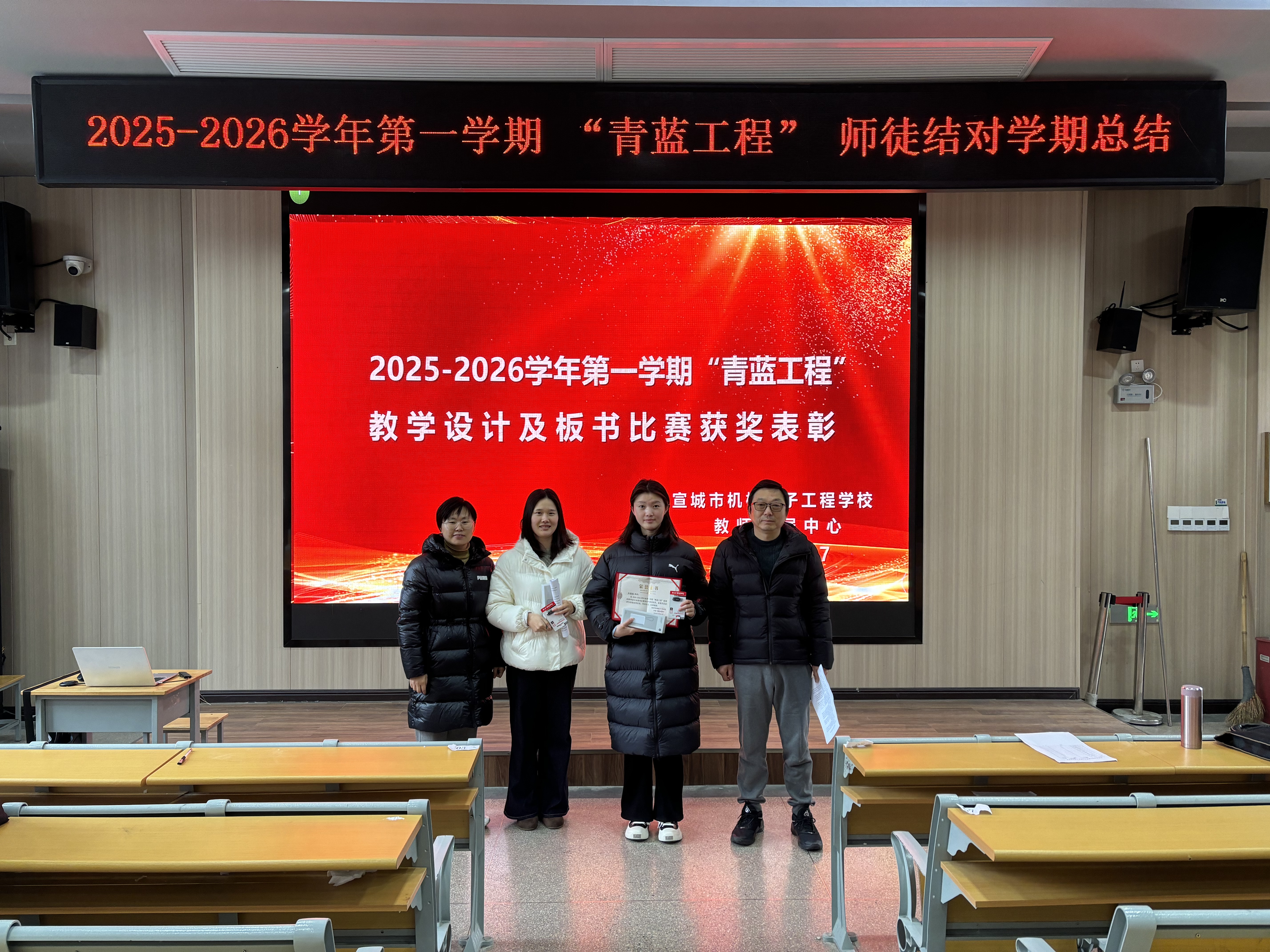 会议第一项,何丽娜就2025-2026学年度第一学期“青蓝工程”新教师教学设计及板书比赛活动进行了全面总结。她在肯定全体新教师一学期以来始终保持谦逊好学、积极进取态度,认真参与教研、主动请教、勤于反思的同时,也指出了比赛中暴露出的部分问题:如教学设计书写规范性有待加强,对教学目标、重难点的把握需更精准,教学流程的逻辑性与连贯性有待提升;少数教师对教学设计理解存在偏差,未能充分结合学情优化环节,导致设计与课堂实践衔接不足。会上,何丽娜为在比赛中表现优异的戴静、李春辉、方敏、朱傲楠四位新教师及其指导教师颁发了获奖证书,师徒共同上台合影留念。