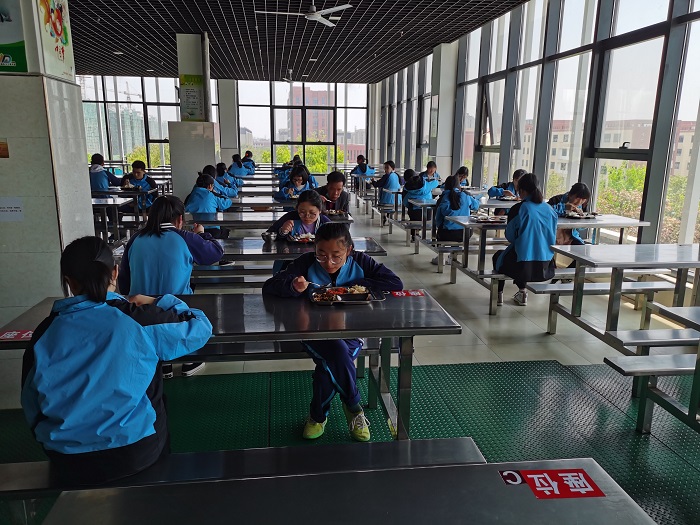 返校后,实行分时错峰就餐,由班主任带队陪餐,学生在食堂分区分片就座,就餐时不言语、不交流。