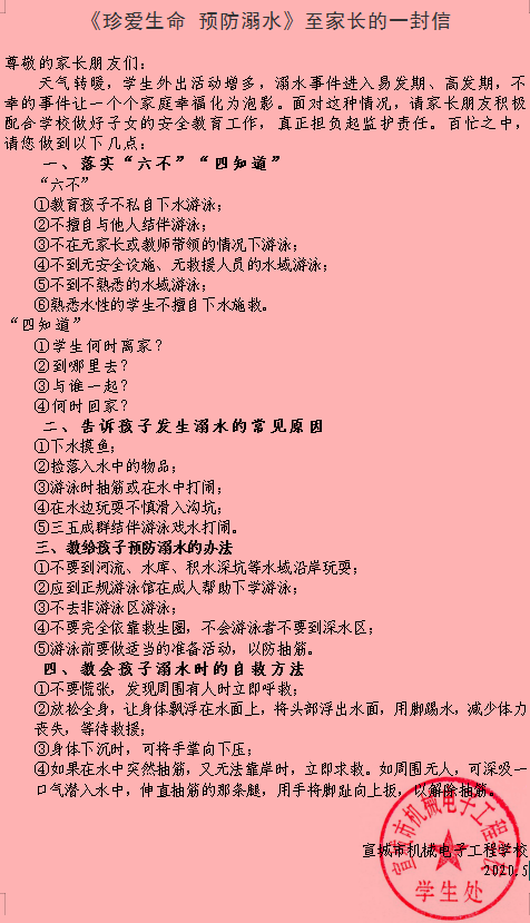 为增强师生安全意识,提高安全防范能力,避免溺水事故的发生,5月中旬以来,宣城市机电学校多途径开展了 “珍爱生命,预防溺水” 安全教育活动。