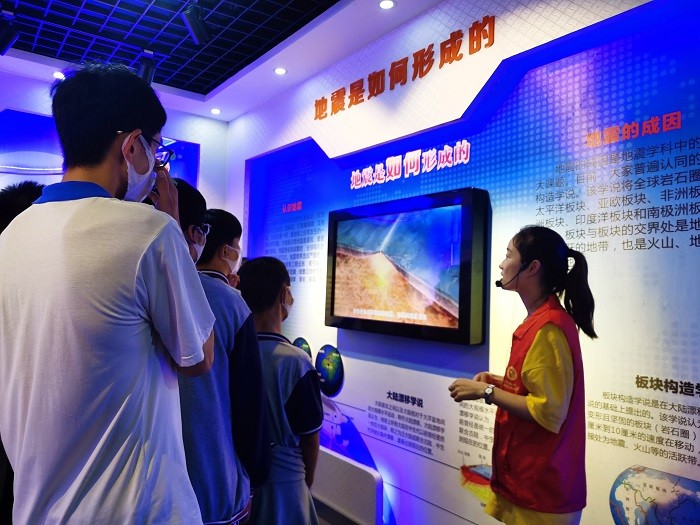 广德市防震减灾科普馆以“普及防震减灾知识,提高自救呼救能力”为主题,分为“感受展区”“地震知识展区”“科学防御展区”“尾厅”四大展厅,共设展品24项,从认识、体验、预警、防御四个角度,运用栩栩如生的模型、丰富多彩的动态图像、寓教于乐的互动模拟实验、身临其境的震撼体验、通俗易懂的图文等多种形式向同学们传达防震减灾知识。