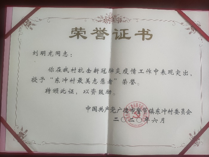 6月24日上午,宣城市机械电子工程学校教师刘明龙在广德市誓节镇东冲村抗疫表彰大会上获“东冲村最美志愿者”荣誉称号。