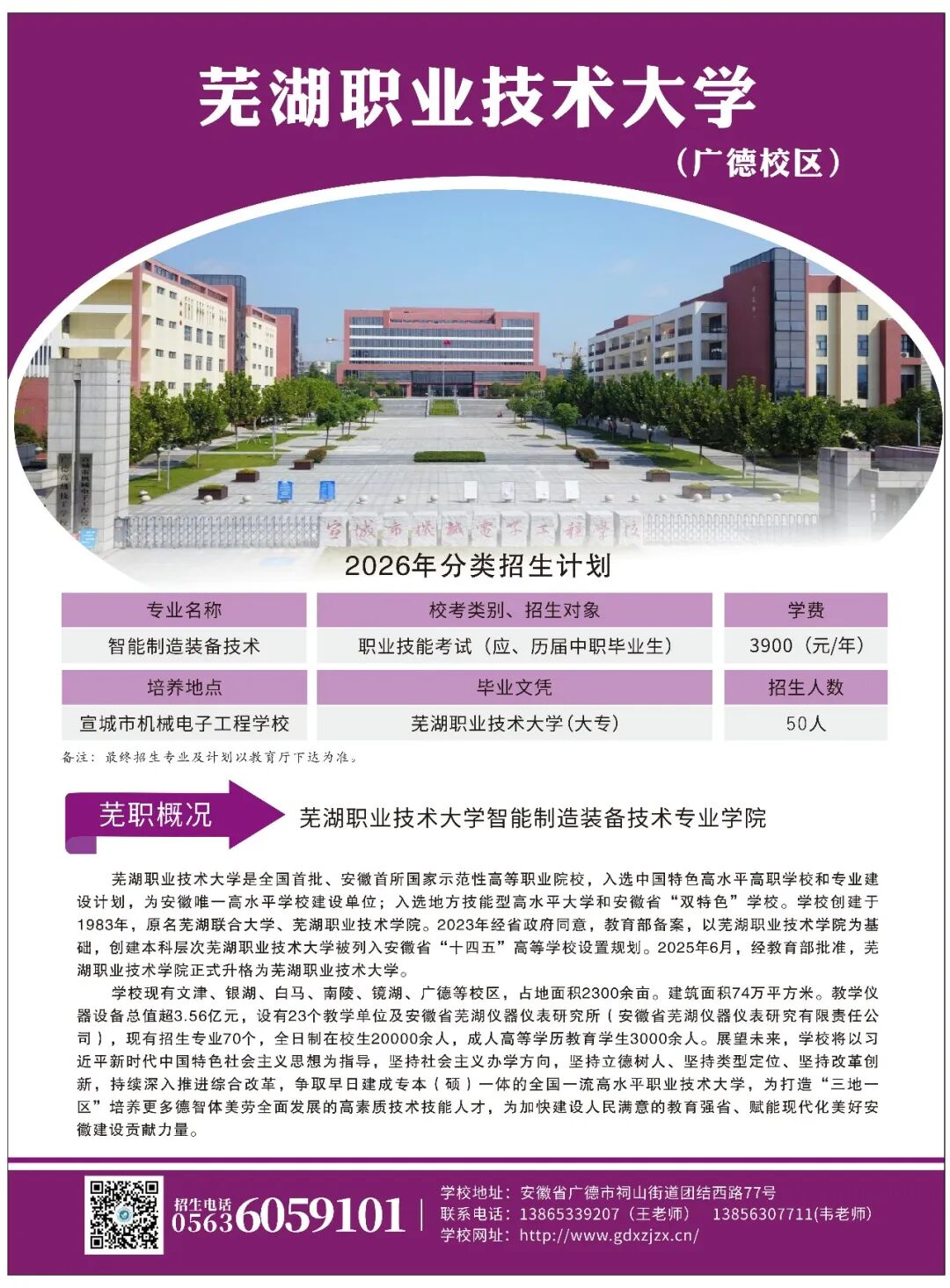 芜湖职业技术大学广德校区2026年秋季招生简章