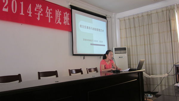 8月29日上午8:30分,市机电学校新学年班主任培训会隆重召开。会议由学生处主任杨林主持,周昌月老师就暑期参加省中职班主任培训班的情况给全校班主任进行了培训。她培训的题目是《班主任素养与班级管理艺术》,共分三个方面: